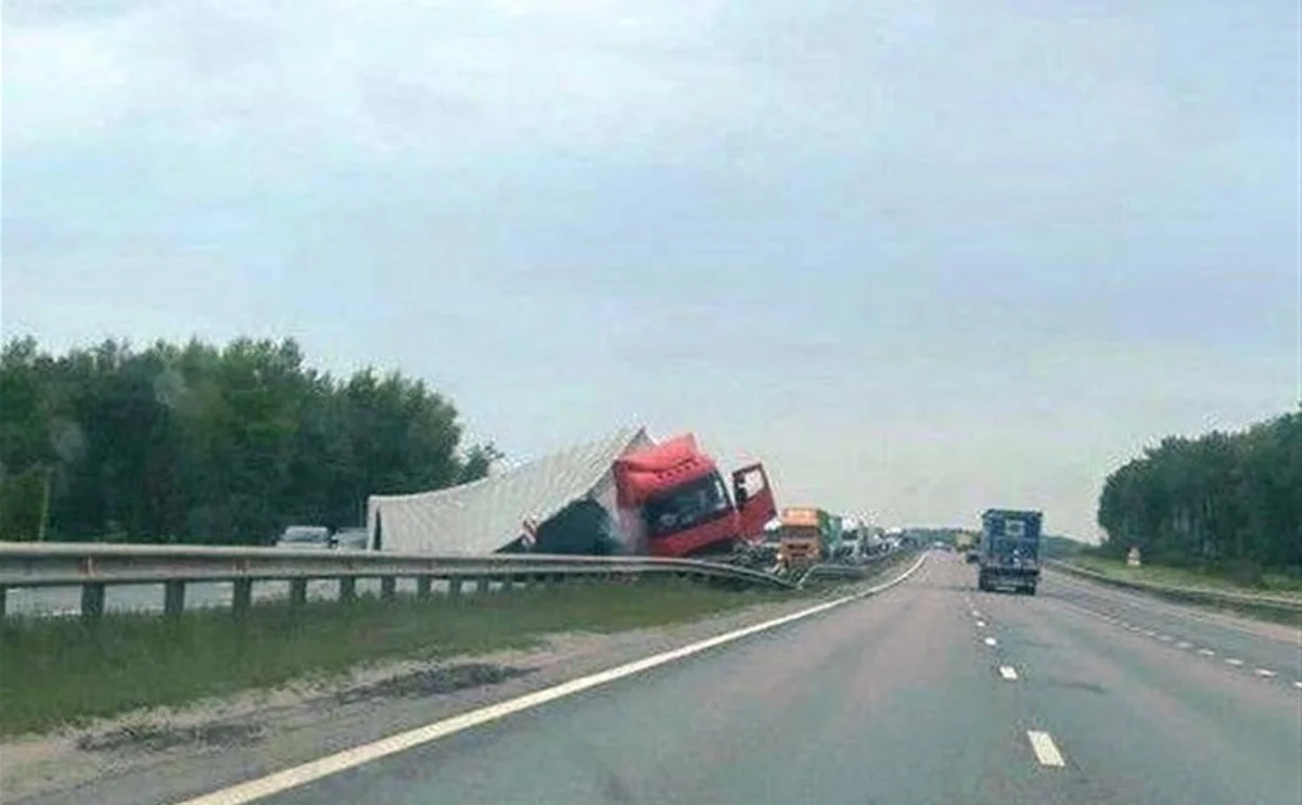 Так, водитель грузового транспортного средства не справился с управлением, врезался в отбойник и перевернулся.