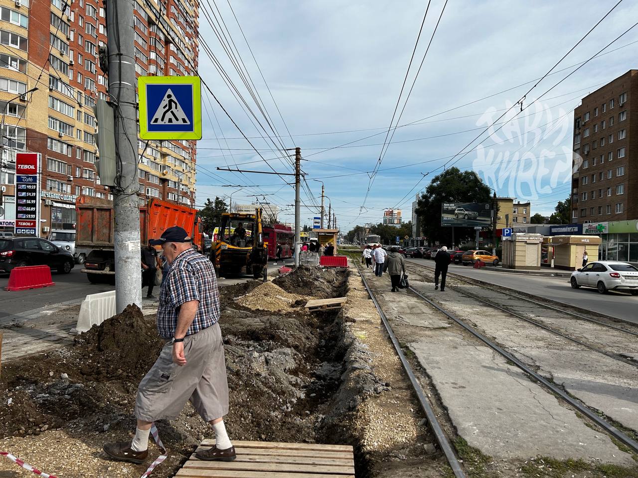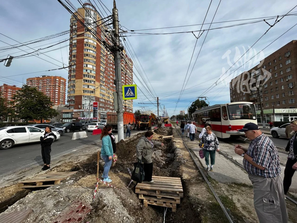 Там, где люди дождаются автобусов и маршруток, перекопали асфальт. Рабочие положили сверху ямы деревянные паллеты, но для пенсионеров они небезопансые.