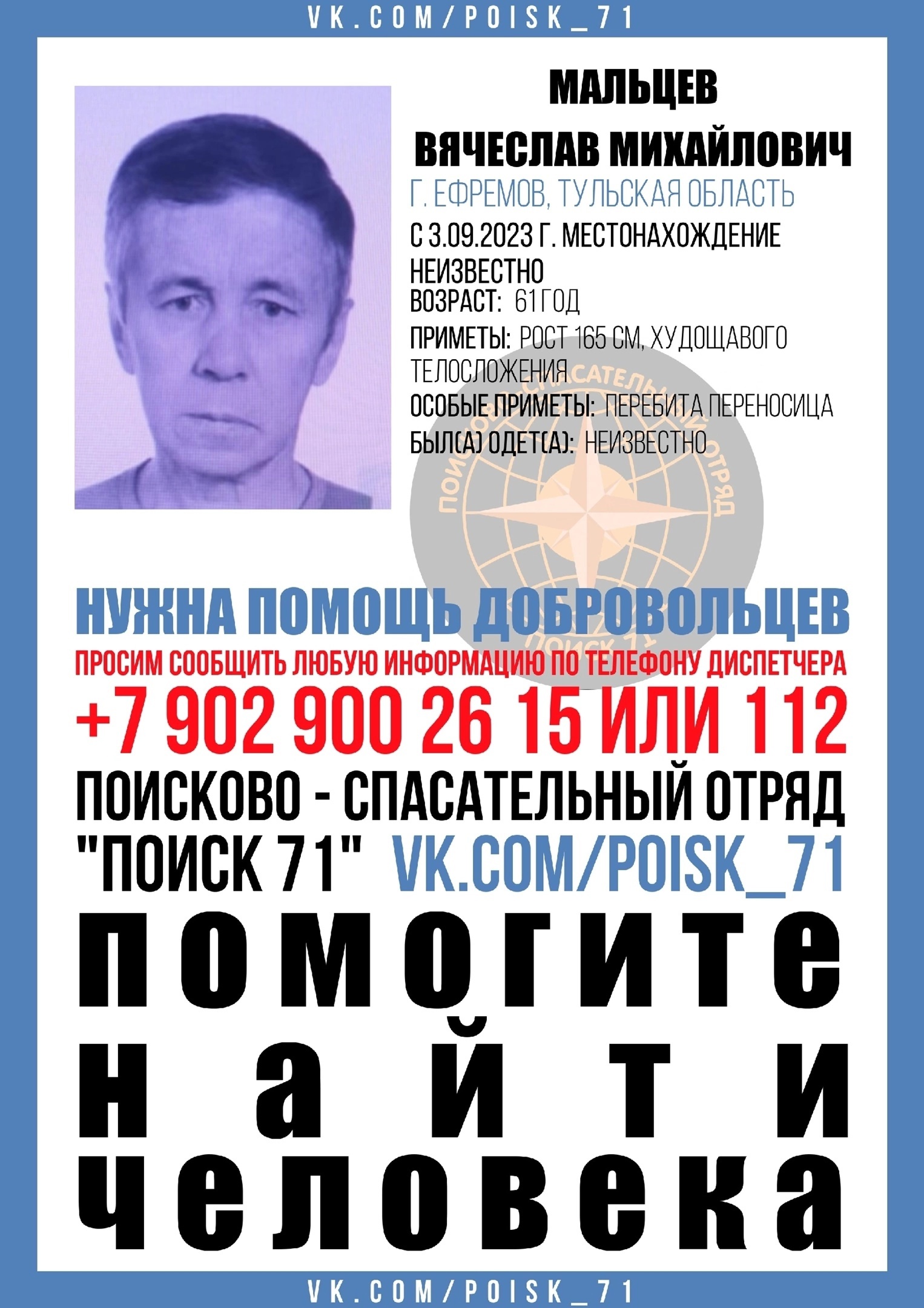Если вам что-либо известно о местонахождении этого мужчины, сообщите по телефону диспетчера 8(902) 900-26-15 или наберите 112.