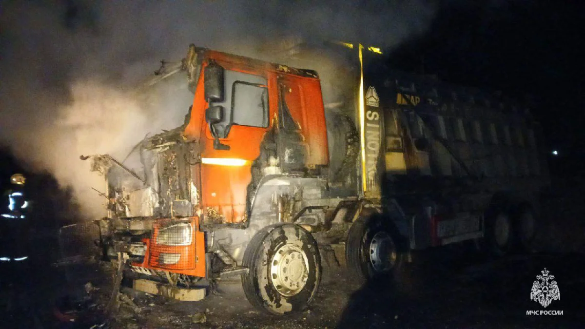Известно, что пожар произошел на улице Молодежная произошло. Один грузовик выгорел полностью, а у второго серьезно пострадала кабина и оплавилось лакокрасочное покрытие.