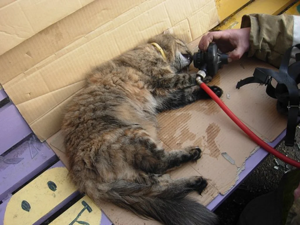 Осматривая помещение Алексей наткнулся на пушистую обитательницу квартиры. Она наглоталась дыма и не подавала признаков жизни.