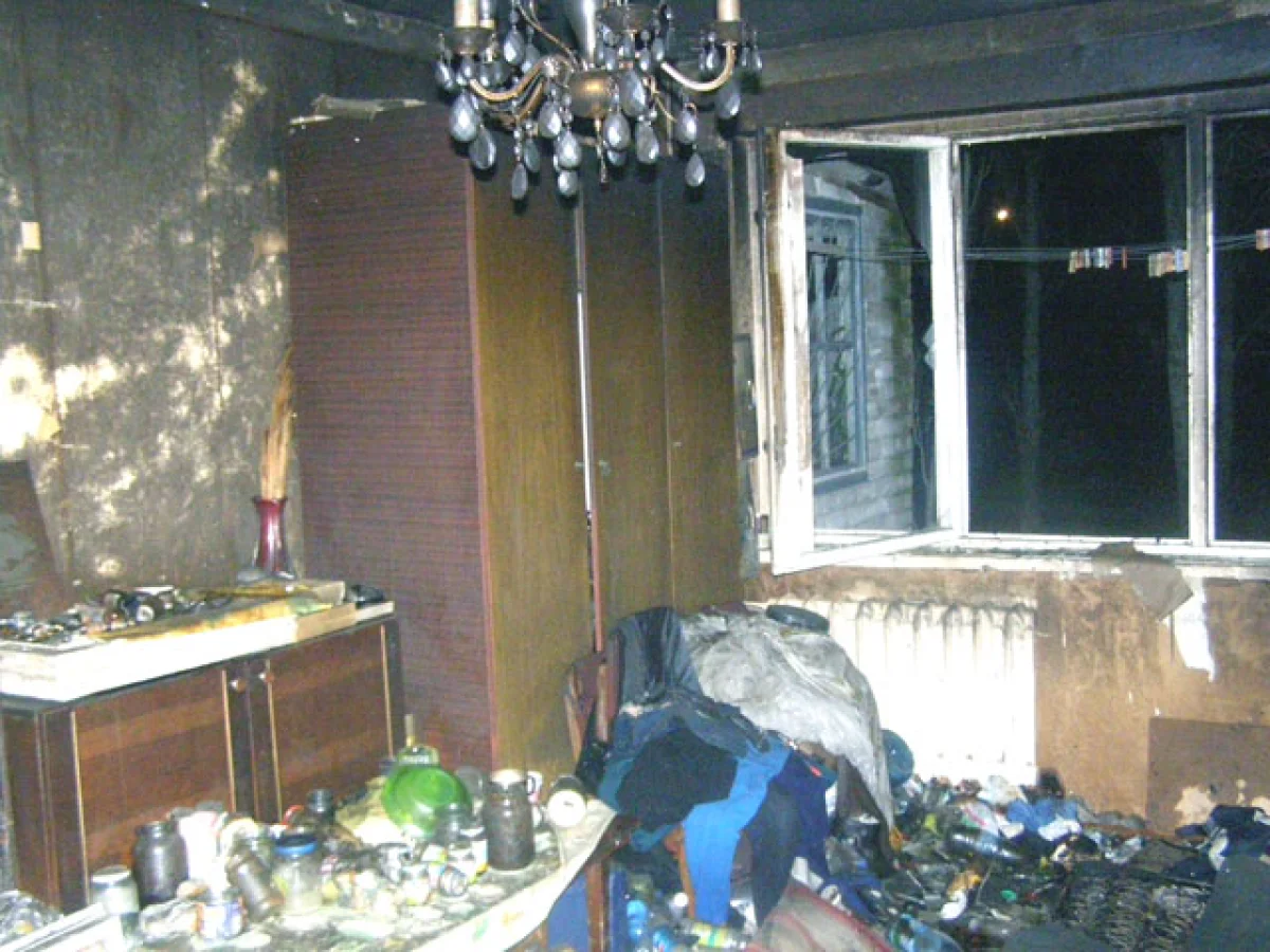 В результате происшествия в ванной комнате обгорела обшивка стен. Стены и потолок закопчены.