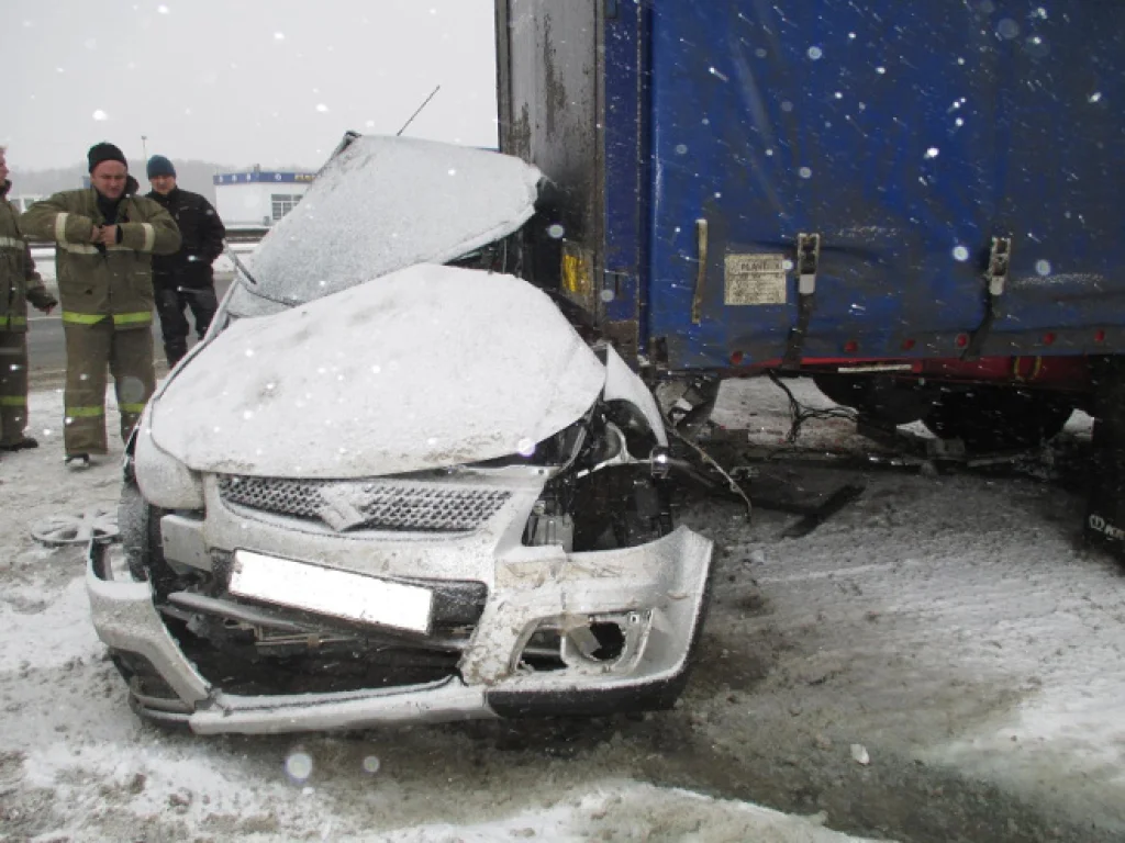 32-летний водитель грузового автомобиля «Рено Премиум» остановился на заправке. Через некоторое время в заднюю часть машины врезался легковой «Сузуки». Управлявший им 45-летний мужчина не справился с управлением на скользкой дороге.