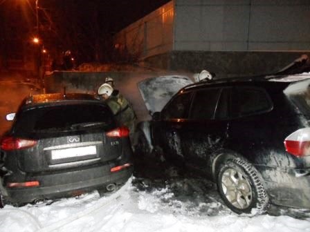 Приехавшие в течение 5-ти минут два пожарных расчета увидели, что горят припаркованные в метре друг от друга "Инфинити" и "БМВ".