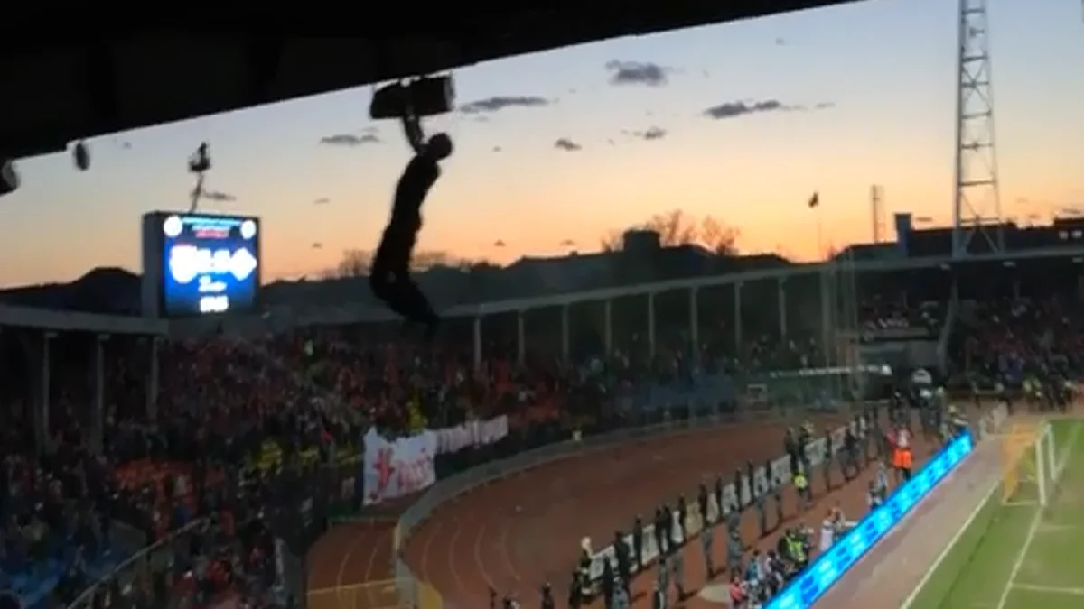 Фанатов "Спартака" залезших на крышу стадиона в Туле сняли на видео. Один из них упал