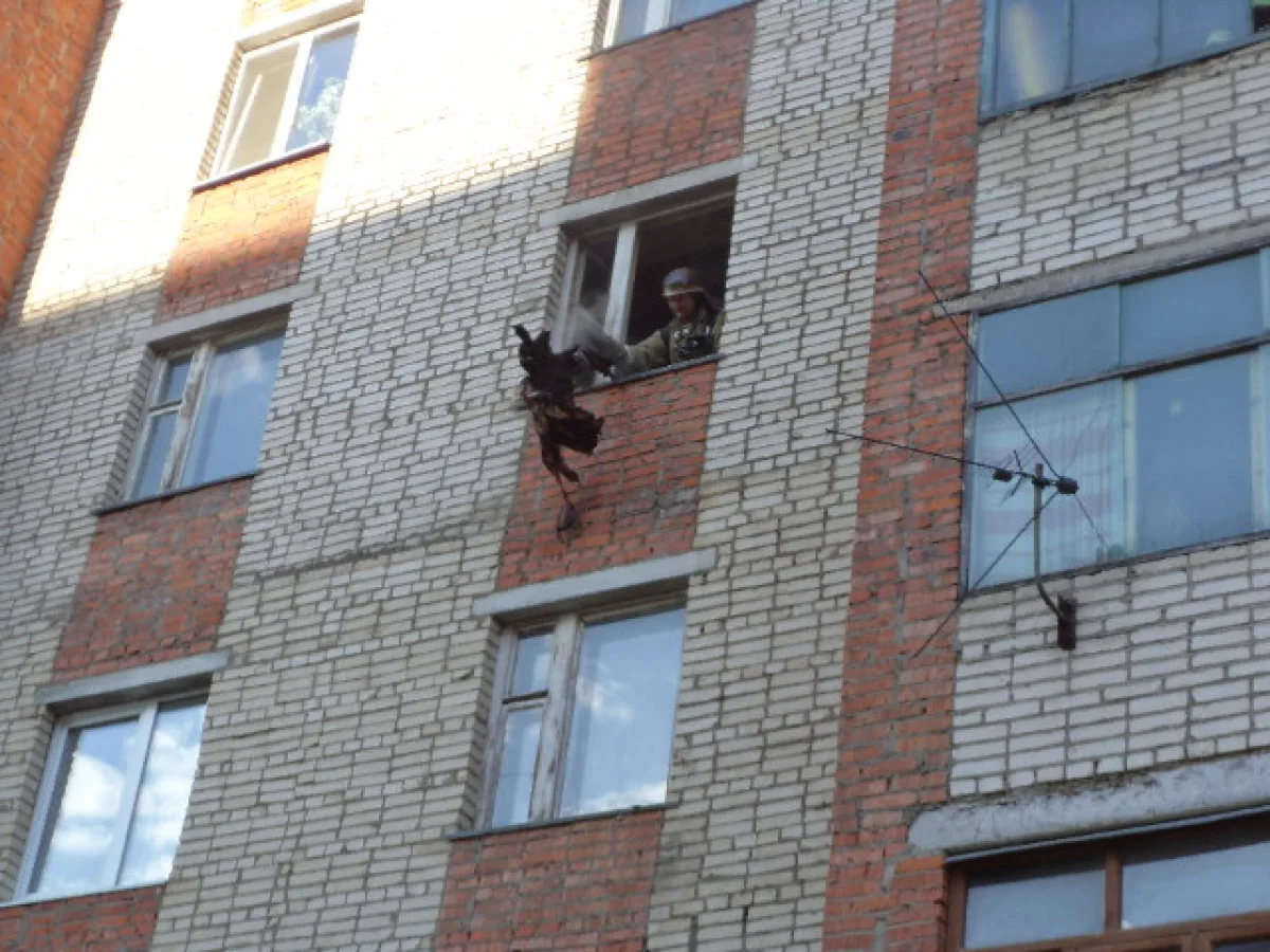 Пострадала хозяйка квартиры, которая надышалась дымом. Её из задымленного помещения вывели сотрудники звена газодымозащитной службы, надев на беспомощного человека дыхательный аппарат.