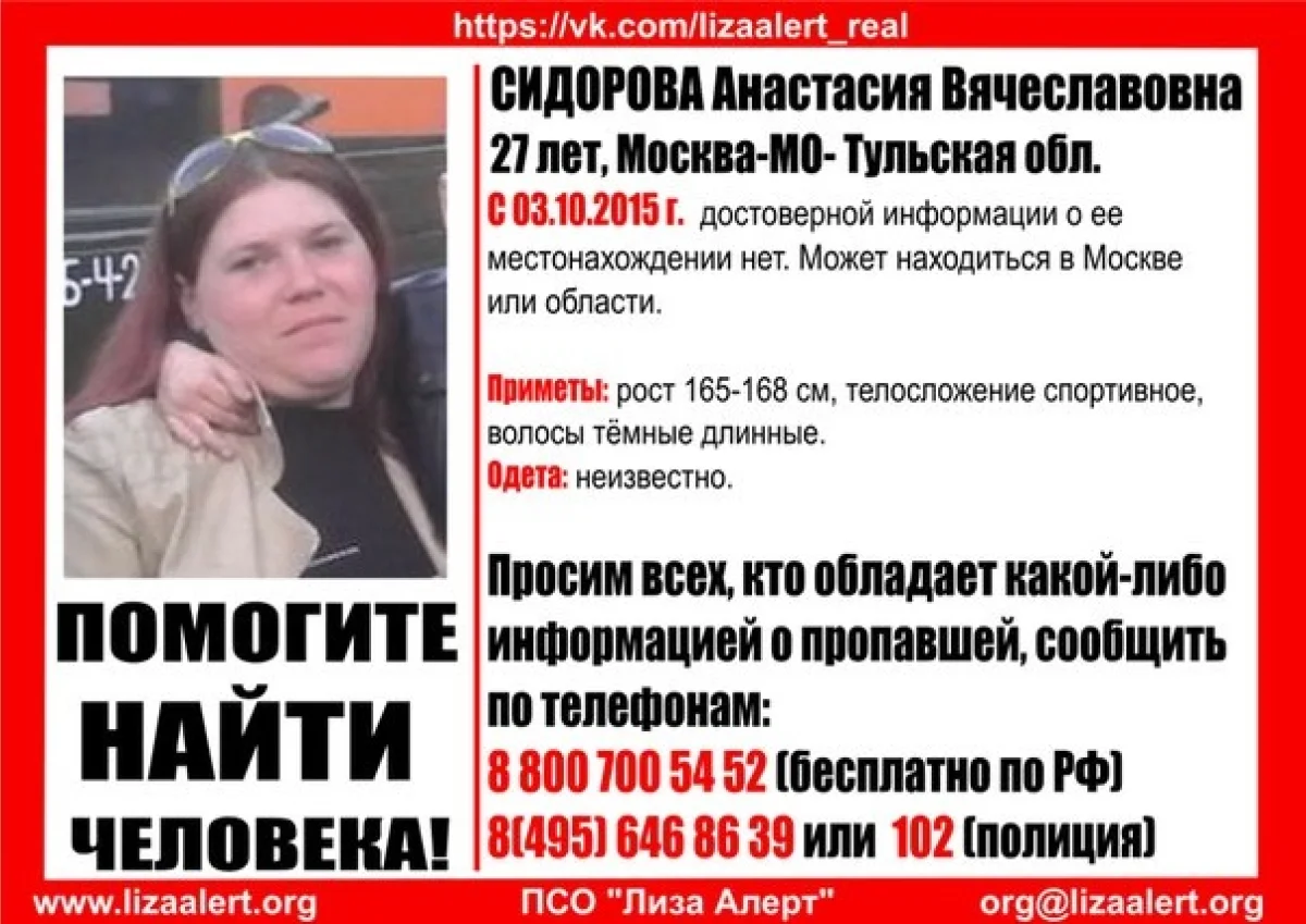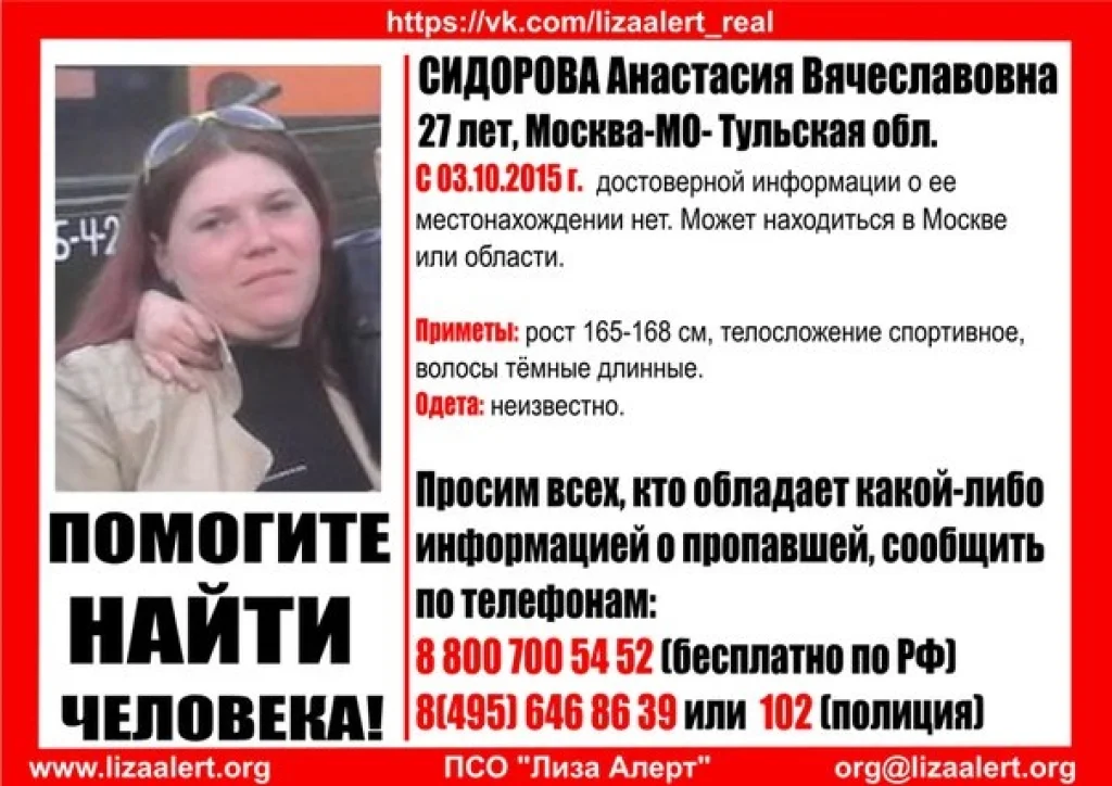 В соцсетях появилась информация о поиске пропавшей Сидоровой Анастасии Вячеславовны 1987 года рождения.