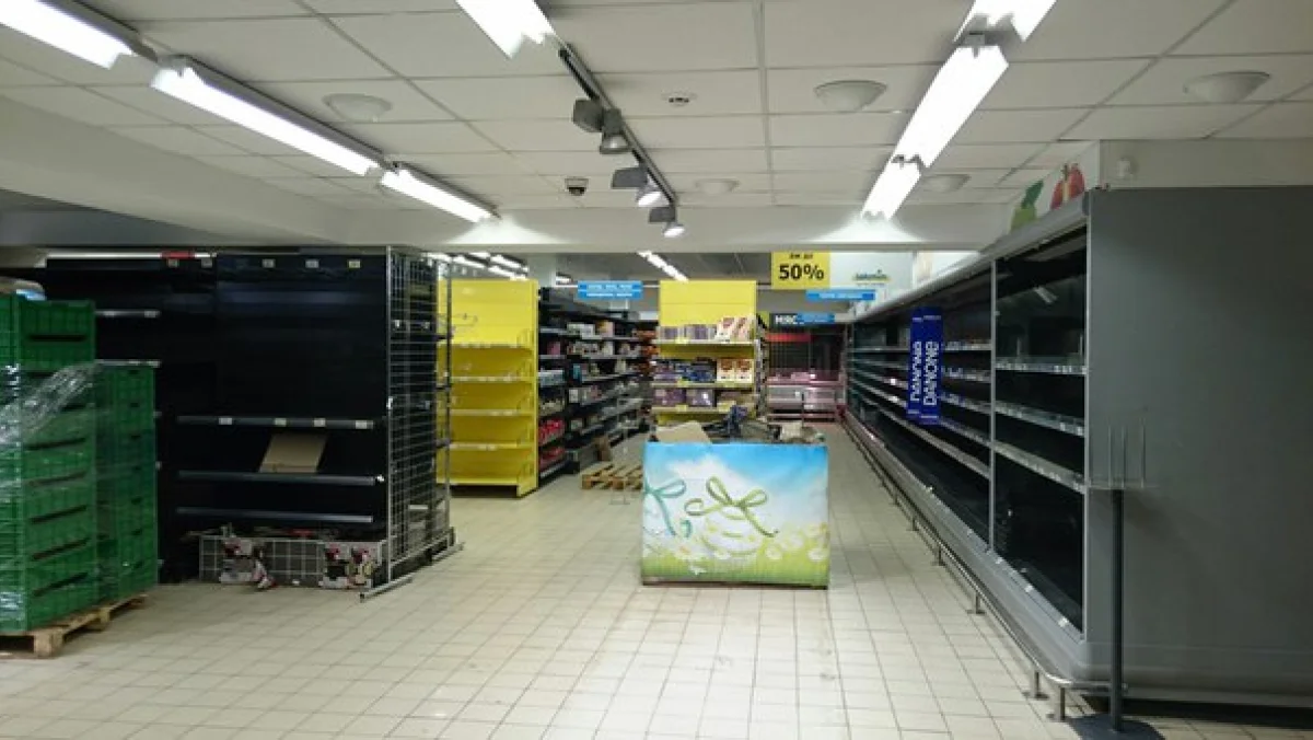 Полки магазинов стремительно опустели, в некоторых супермаркетах остался только алкоголь. Повсюду висят таблички с предложением купить продукты с 50% скидкой, правда, покупать уже нечего, потому что весь товар отвезли обратно на склад.