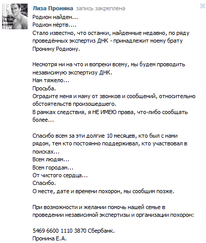 «Родион найден. Родион мёртв. Стало известно, что останки, найденные недавно, по ряду проведённых экспертиз ДНК - принадлежит моему брату Пронину Родиону», - написала на своей страничке в соцсети сестра молодого человека - Лиза Пронина.