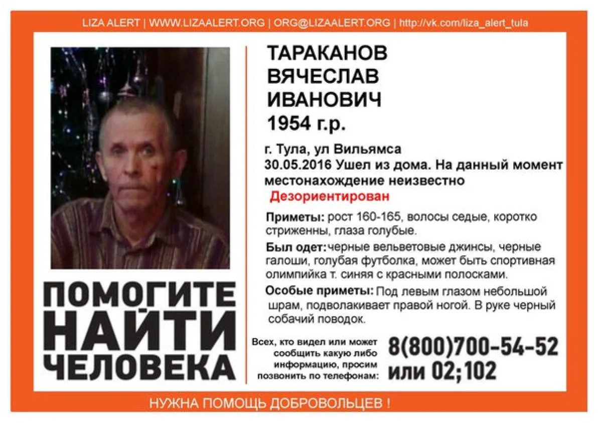 В Туле пропал Тараканов Вячеслав Иванович. Известно, что с 30.05.2016 г. он вышел из дома на ул. Вильямса, с тех