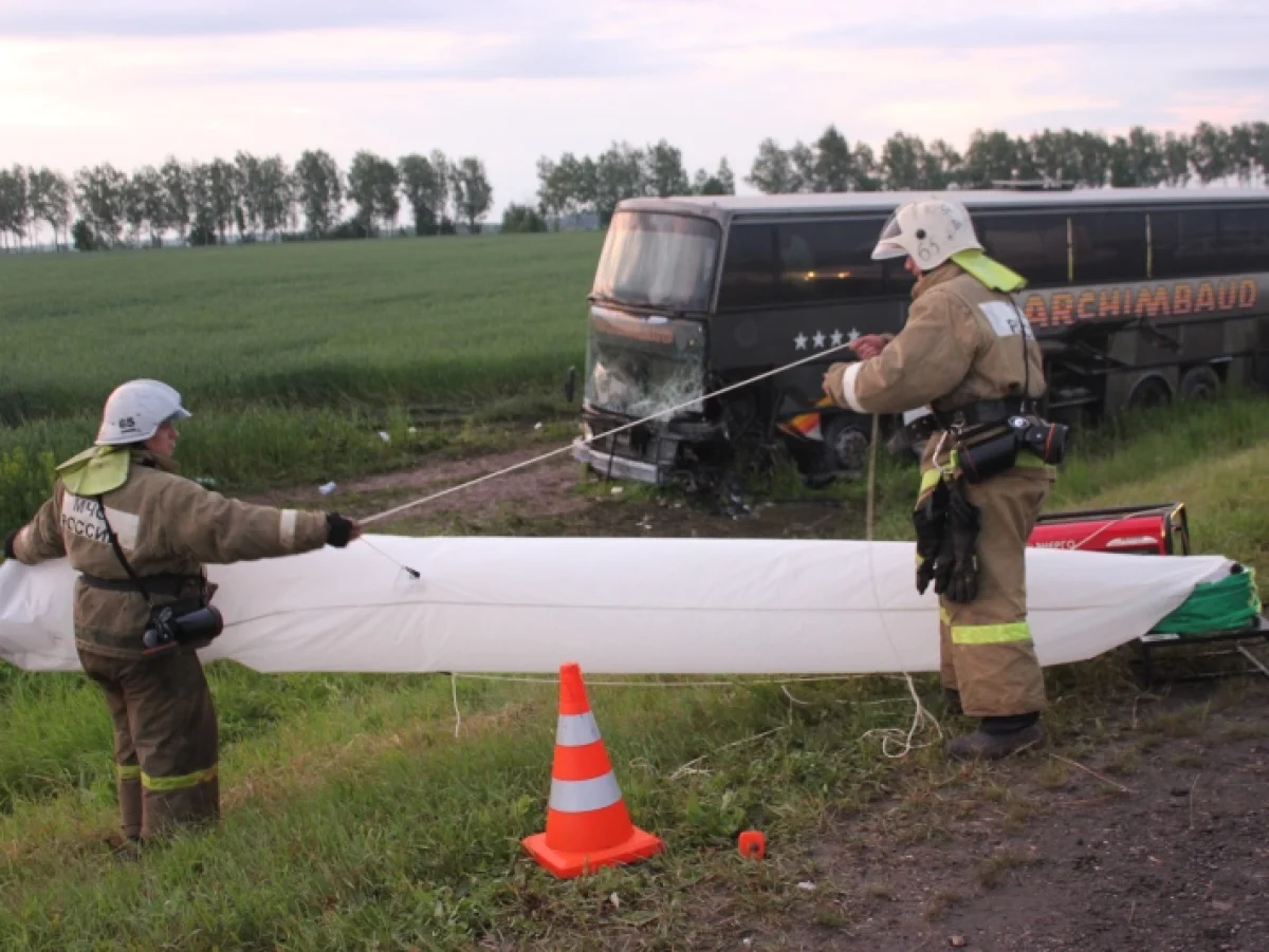 Под Тулой в результате столкновения грузового "Мерседеса" и автобуса пострадавших извлекали при помощи специнструмента
