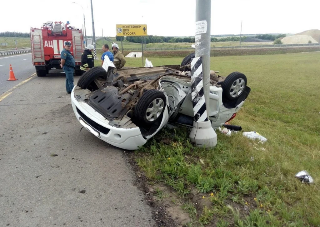 Женщина-водитель за рулем автомобиля «Renault Sandero» ехала в сторону Воронежа. На мокрой дороге она не справилась с управлением, перевернулась и врезалась в столб электропередач.