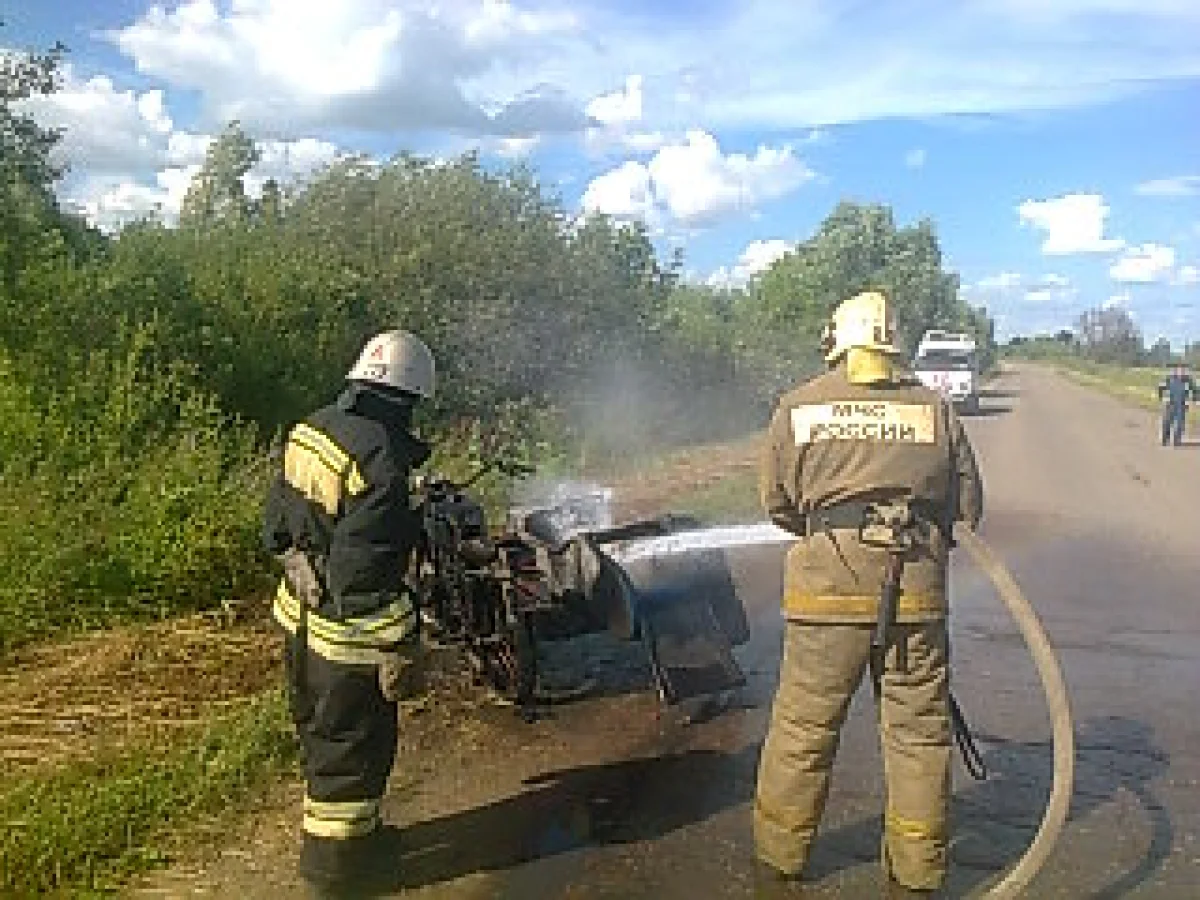 Сообщение о возгорании мотоцикла поступило на пульт диспетчера 11 июля в 15:56. Мотоцикл "Днепр" был припаркован в Ефремовском районе, на 5 км трассы «Ефремов-Дубики».
