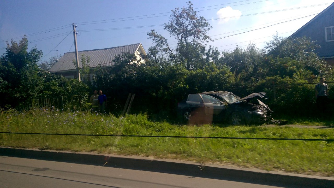 Как сообщают очевидцы, иномарка на большой скорости врезалась в столб. Машину вынесло на обочину, практически за забор частного дома. Автомобиль получил довольно сильные повреждения.