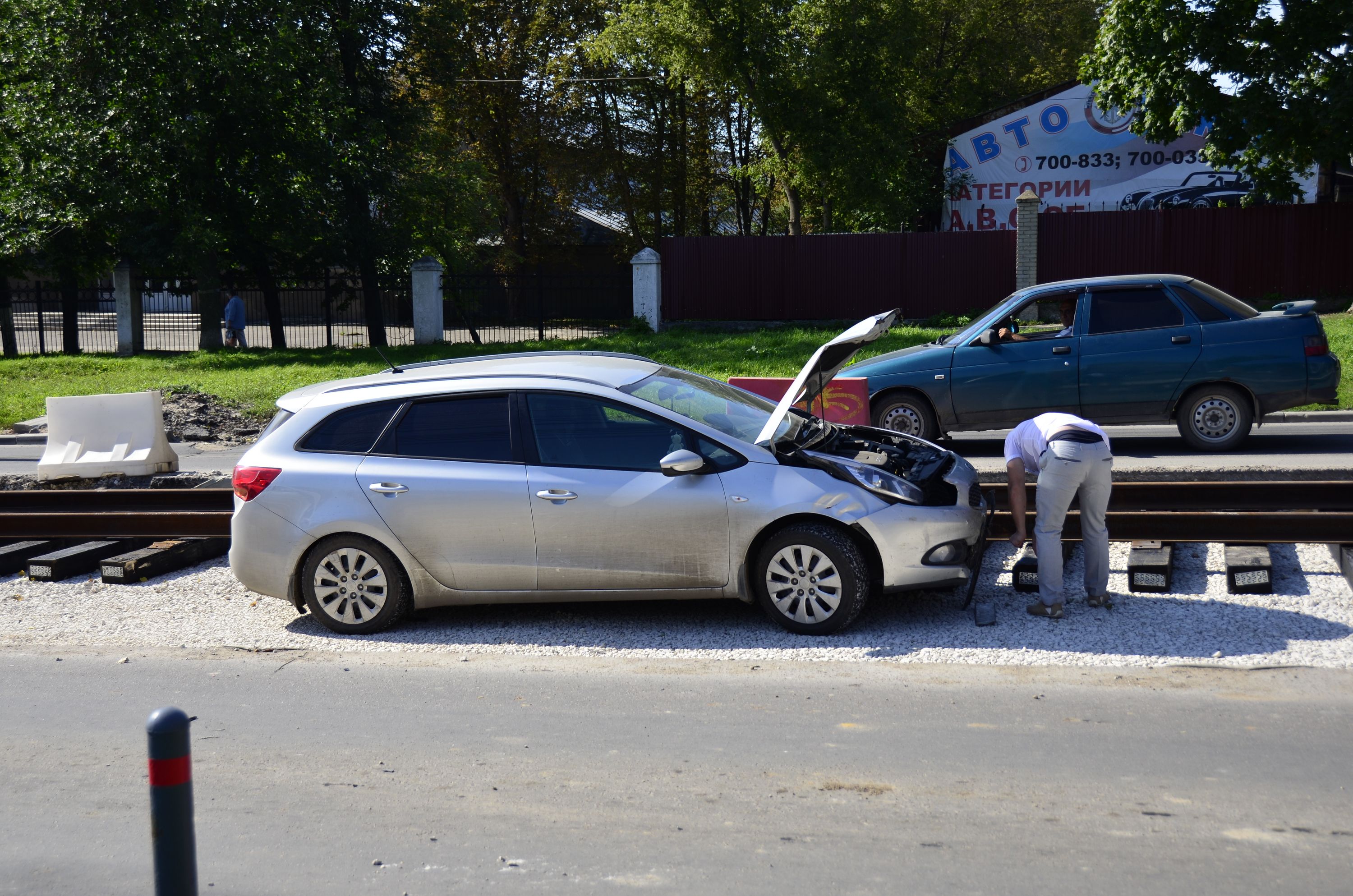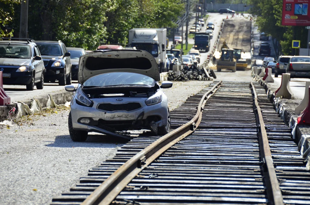 Автомобиль «Киа» съехал с дороги в ремонтную яму и врезался в рельсы.