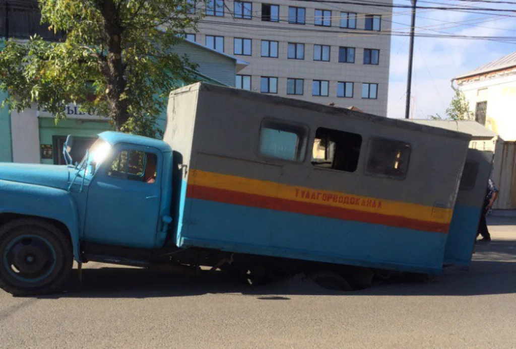 Аварийная машина «Тулгорводлоканала» застряла колесом в провалившемся асфальте на ул. Тургеневской. Фото появилось в соцсети ВК, в группе «Подслушано в Туле».