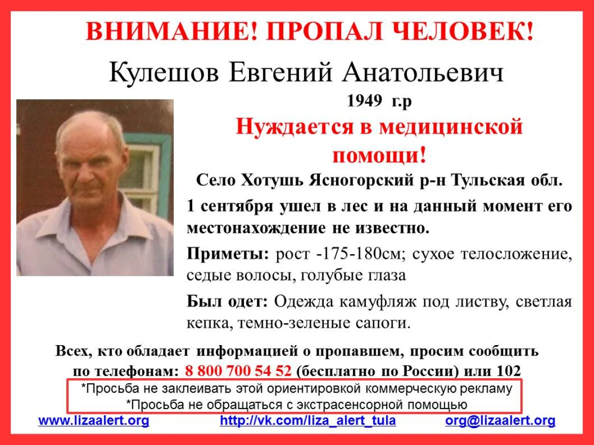 Мужчина 1949 г. р. ушел 1 сентября в лес за грибами и пропал. Последний раз похожего человека видели 3 сентября на ж/д станции в Заокском районе, в 9 часов утра он садился на электричку в сторону Тулы.