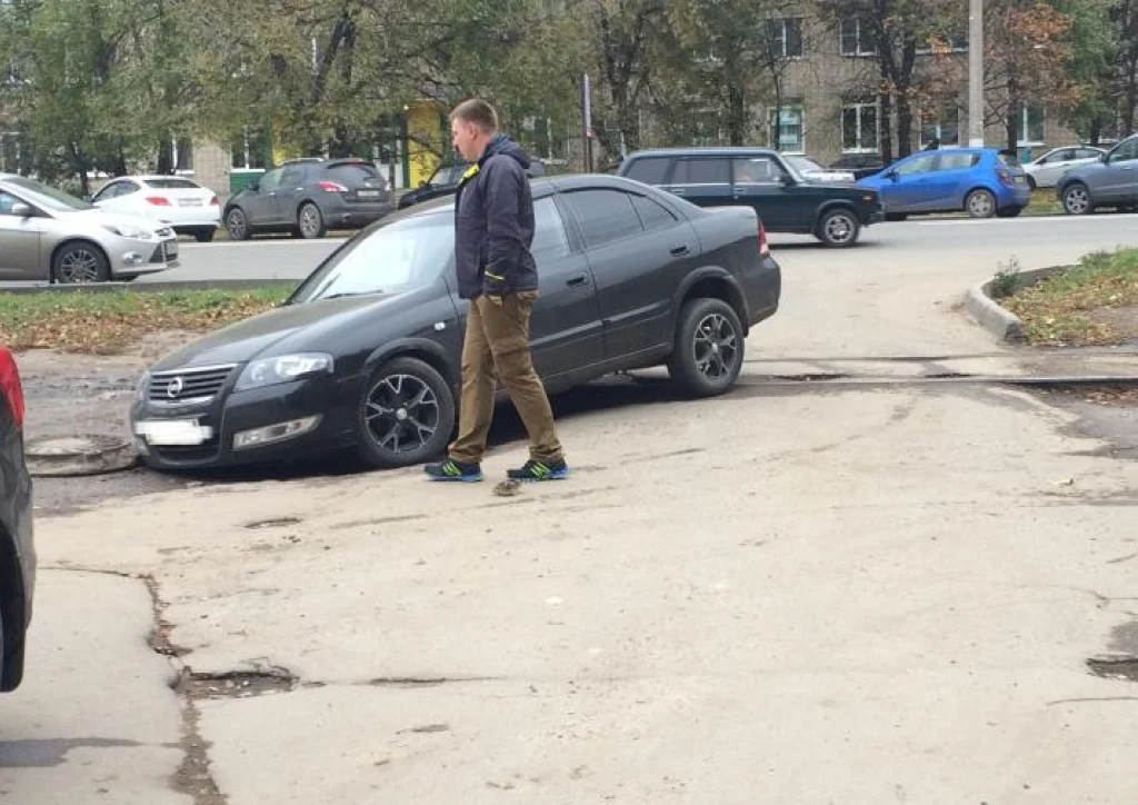 Очередная коварная яма появилась на въезде в один из дворов по ул. Лейтейзена. Жертвой злосчастной дыры стал «Ниссан», колесо которого намертво застряло в выбоине.