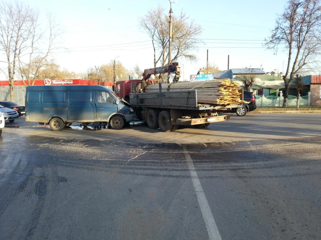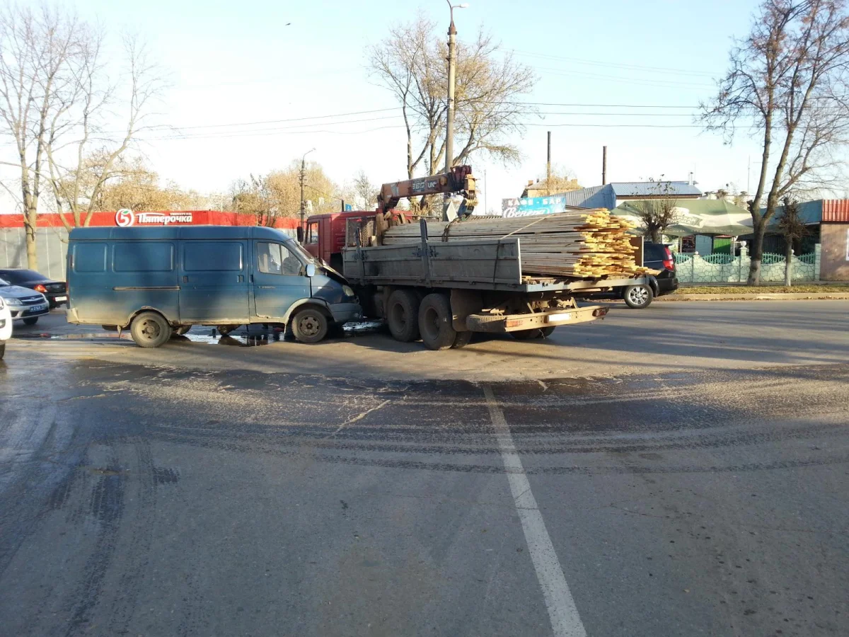 Водитель автомобиля «Камаз», перевозивший доски, на нерегулируемом перекрёстке не пропустил приближающуюся по главной дороге «ГАЗель». В результате произошло столкновение.