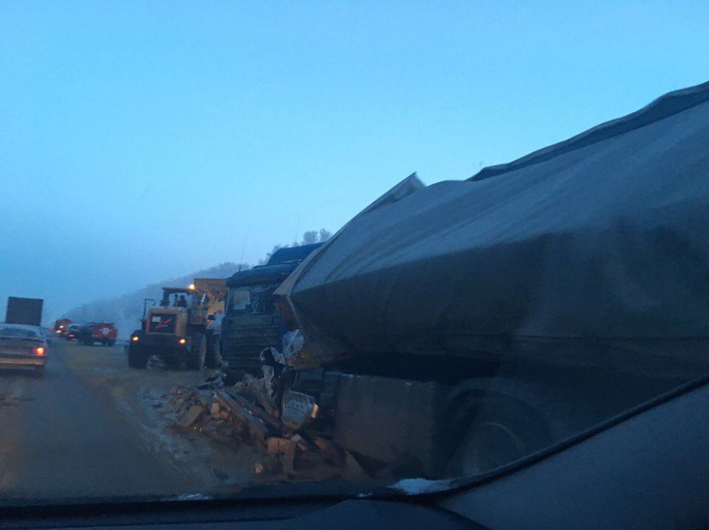 Как сообщают очевидцы в соцсетях, утром 12 декабря на трассе М4 «Дон» столкнулись два большегруза. По