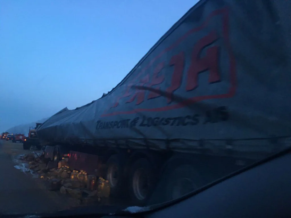 Как сообщают очевидцы в соцсетях, утром 12 декабря на трассе М4 «Дон» столкнулись два большегруза. По