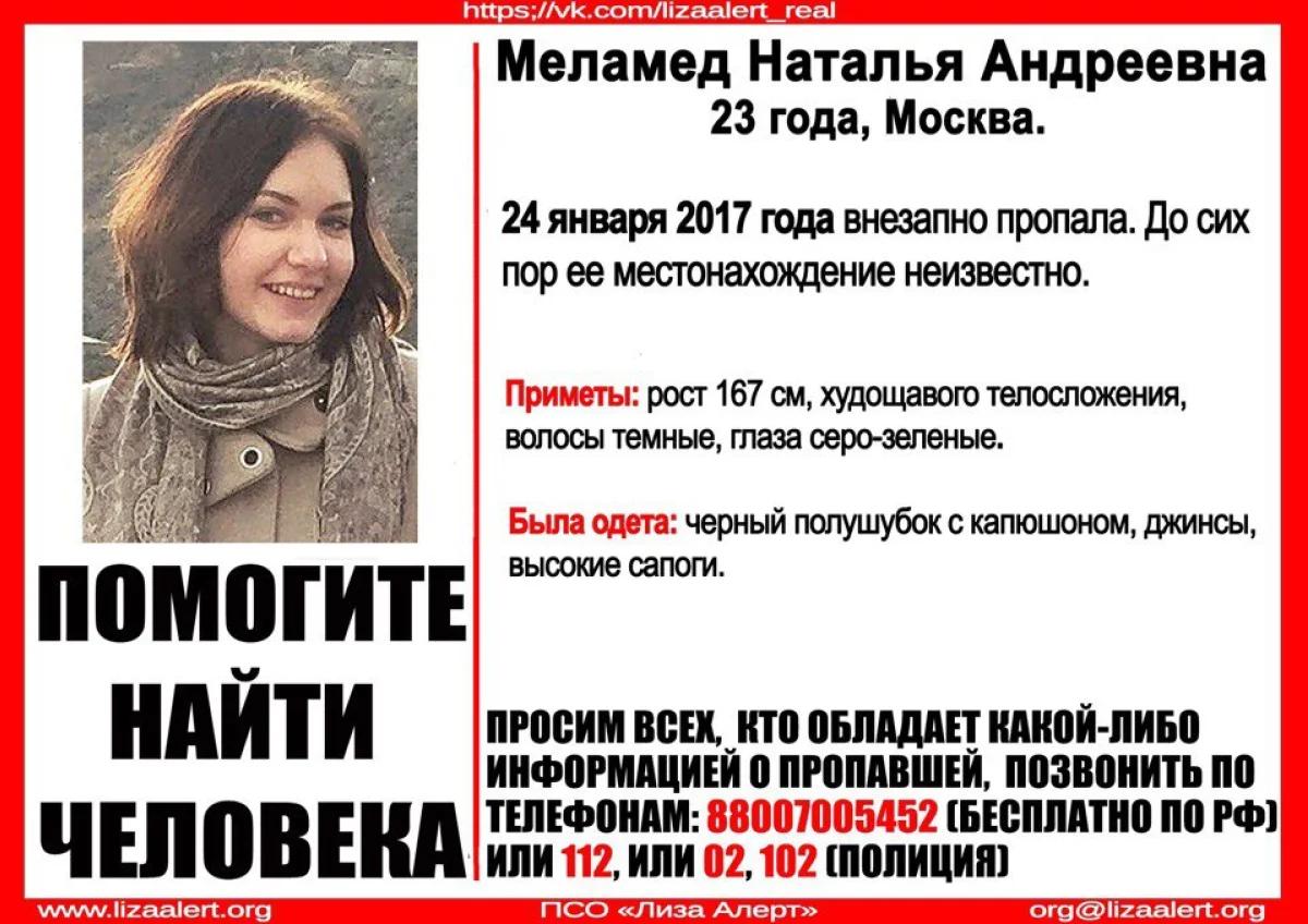 Если кому-либо что-то известно о местонахождении пропавшей Натальи Меламед, просьба позвонить по указанным телефонам: 8-800-700-54-52, 112, 02 или 102.