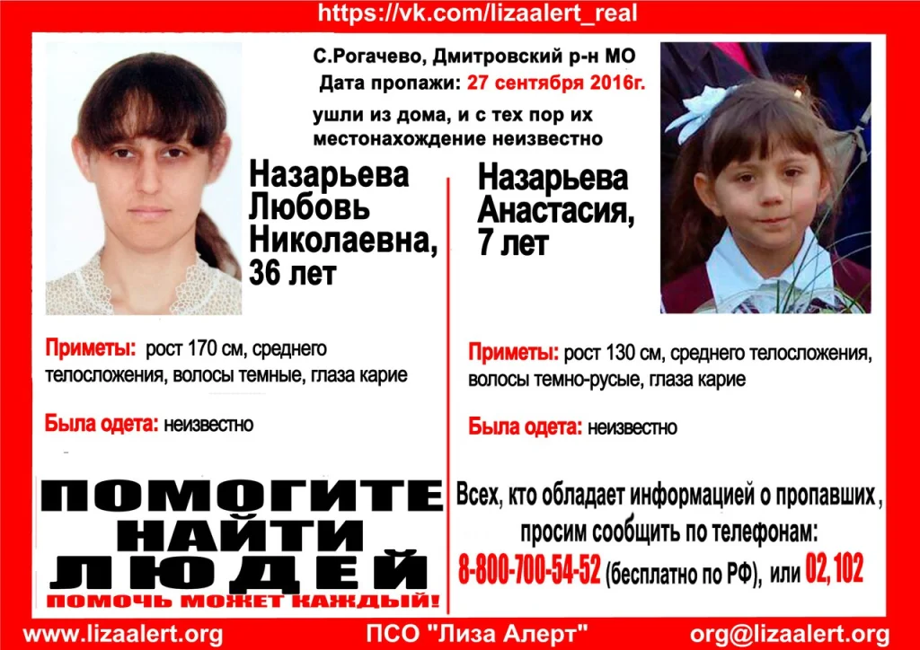Назарьева Любовь Николаевна, 36 лет и Назарьева Анастасия, 7 лет. Проживали в с. Рогачево Дмитровского района Московской области.