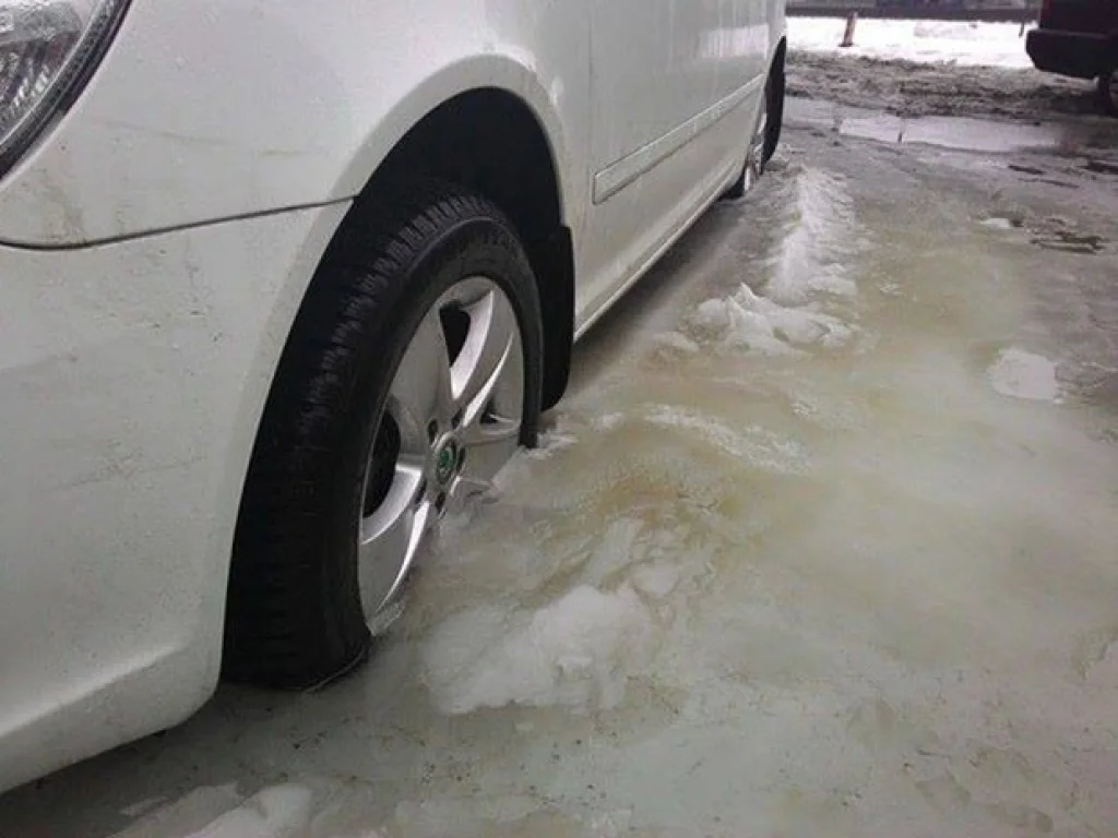 Очередная коммунальная авария произошла накануне в ЖК Зеленстрой-2. Перед подъездом одного из домов разлилось «море», которое тут же замёрзло вместе с колёсами припаркованных во дворе автомобилей.