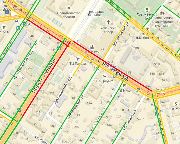 Наш корреспондент также сообщает, что на пересечении улиц Советской и проспекта Ленина не работает светофор. Движением временно управляет регулировщик. Из-за неполадок в работе светофора также возникла пробка. Вернее даже сказать, она продолжилась с первых двух улиц.