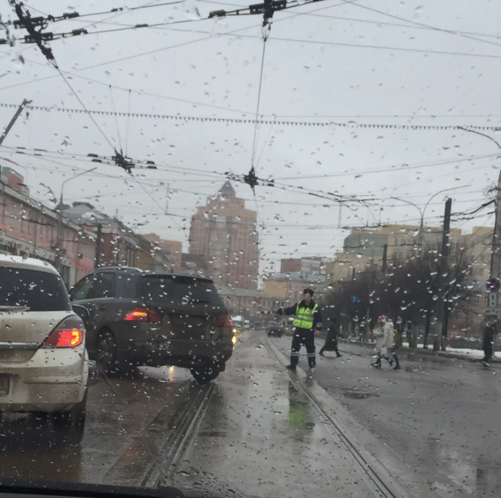 На ул. Советской в Туле пробка: функции светофора выполняет регулировщик