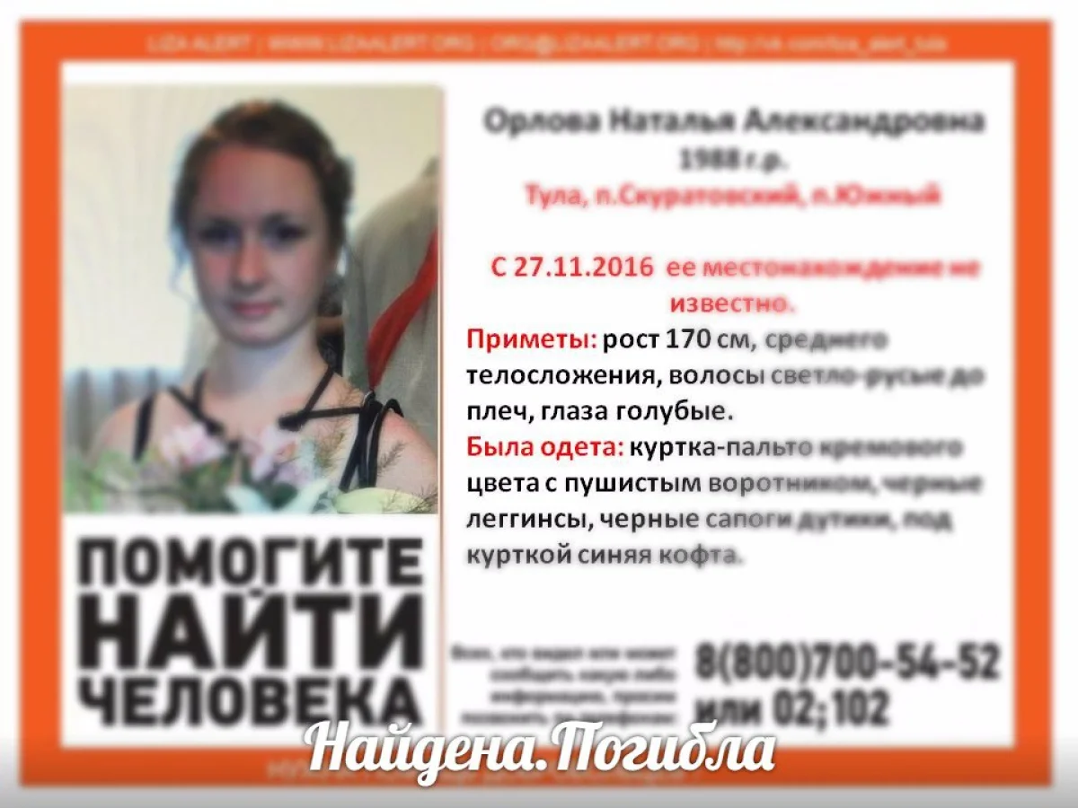 Следователи установили, что погибшая — без вести пропавшая Наталья Орлова, которая ушла из дома 27 ноября 2016. В поисках девушки участвовали волонтеры отряда «Лиза Алерт».