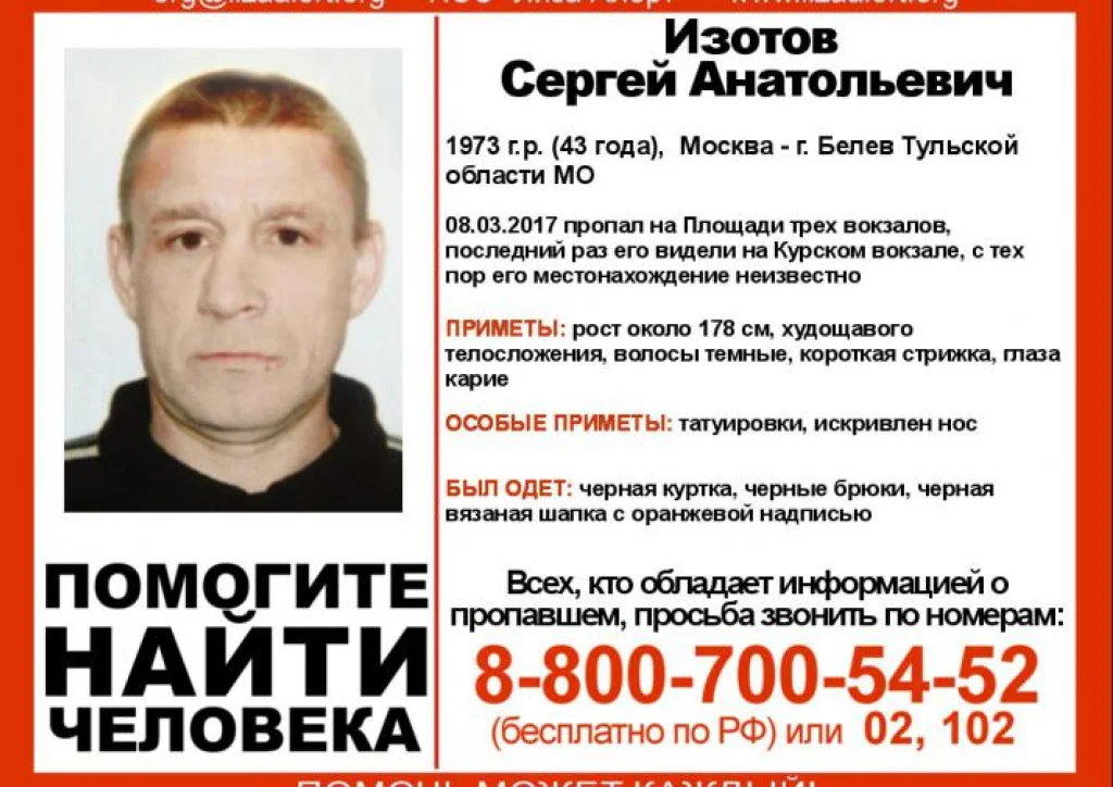 его видели 8 марта в Москве на Площади трех вокзалов. Предположительно, оттуда он мог уехать в город Белев Тульской