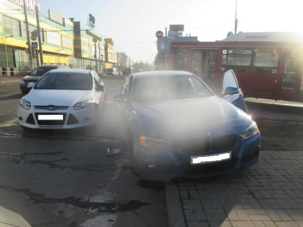 Девушка-водитель автомобиля «Форд Фокус» не справилась с управлением и въехала в «БМВ», за рулём которого также находилась автоледи. В результате столкновения «бэху» отбросило на тротуар.
