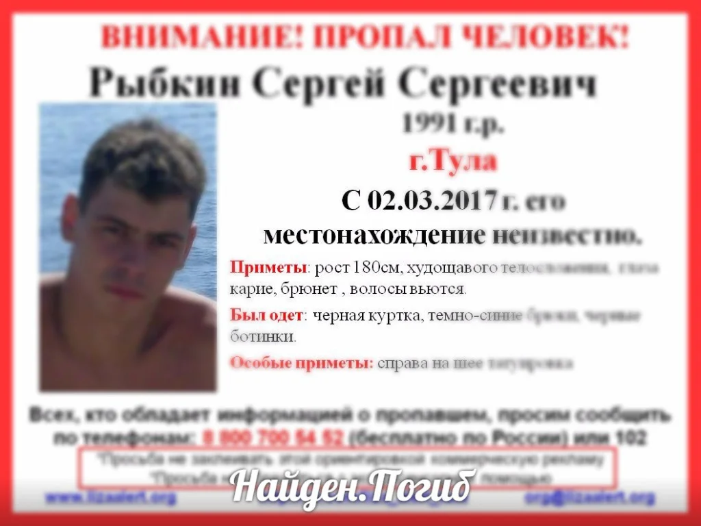 26-летний Рыбкин Сергей Сергеевич, которого разыскивали в Туле, погиб.