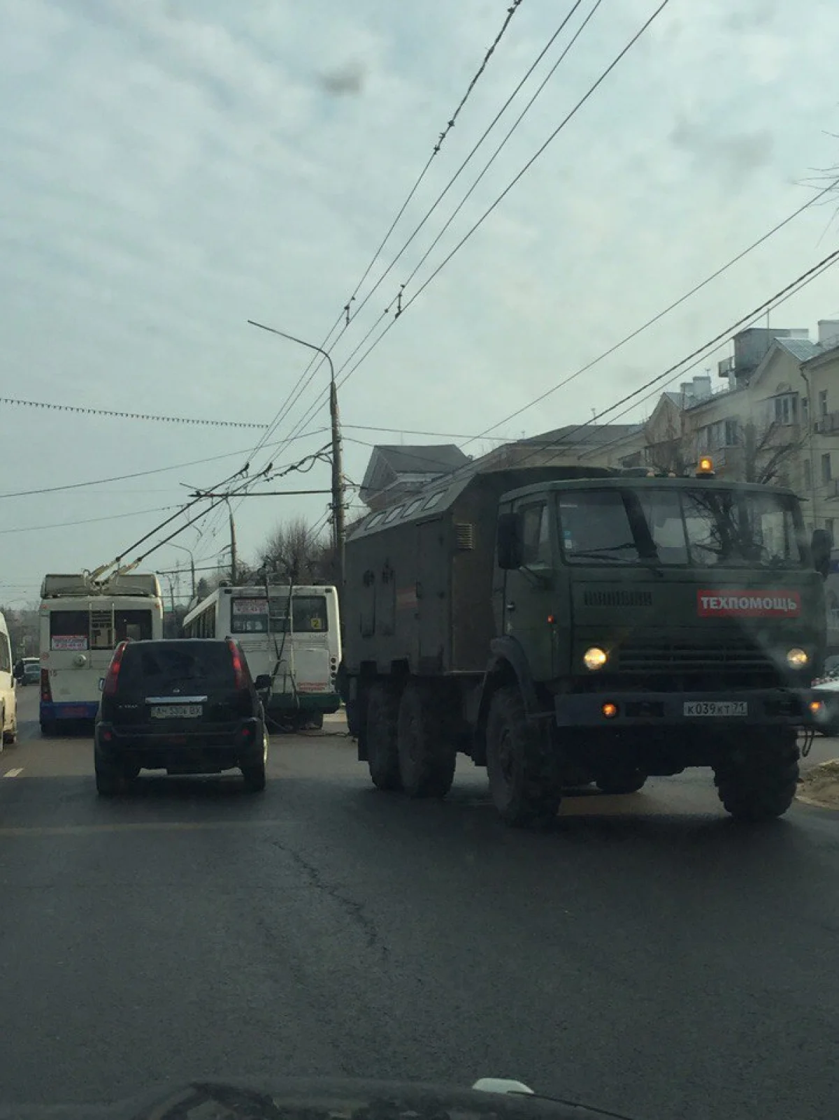 На место аварии прибыла машина спецтехники, которая вызволила троллейбус из «ловушки».
