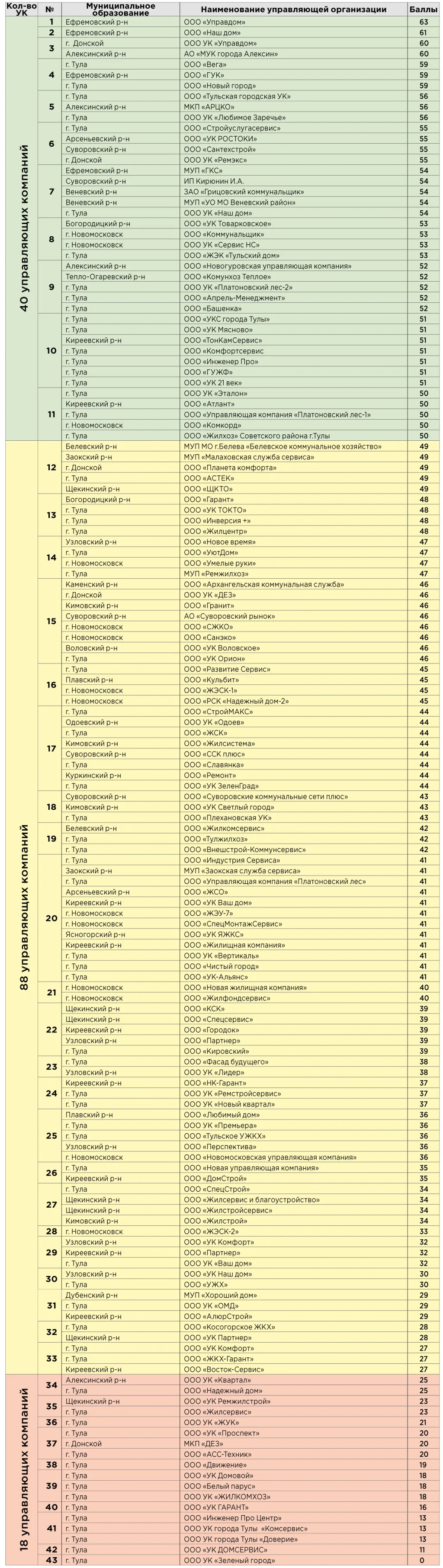 В Туле представили очередной рейтинг управляющих компаний. Теперь чтобы попасть в «зеленую» группу — нужно иметь минимум 50 баллов. Ранее «проходной» порог составлял 45 баллов.