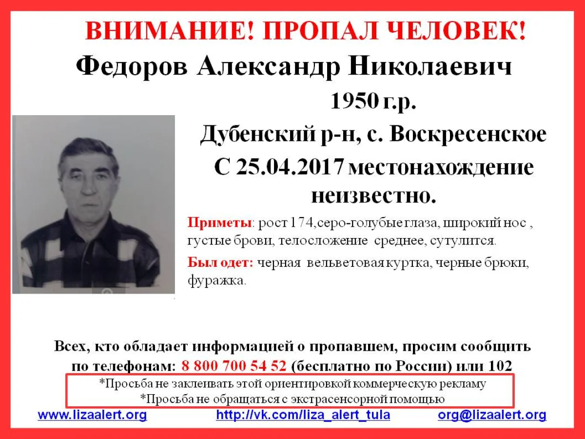Федоров Александр Николаевич 1950 года рождения 25 апреля вышел из дома в с. Воскресенское Дубенского района. С тех пор его местонахождение неизвестно.