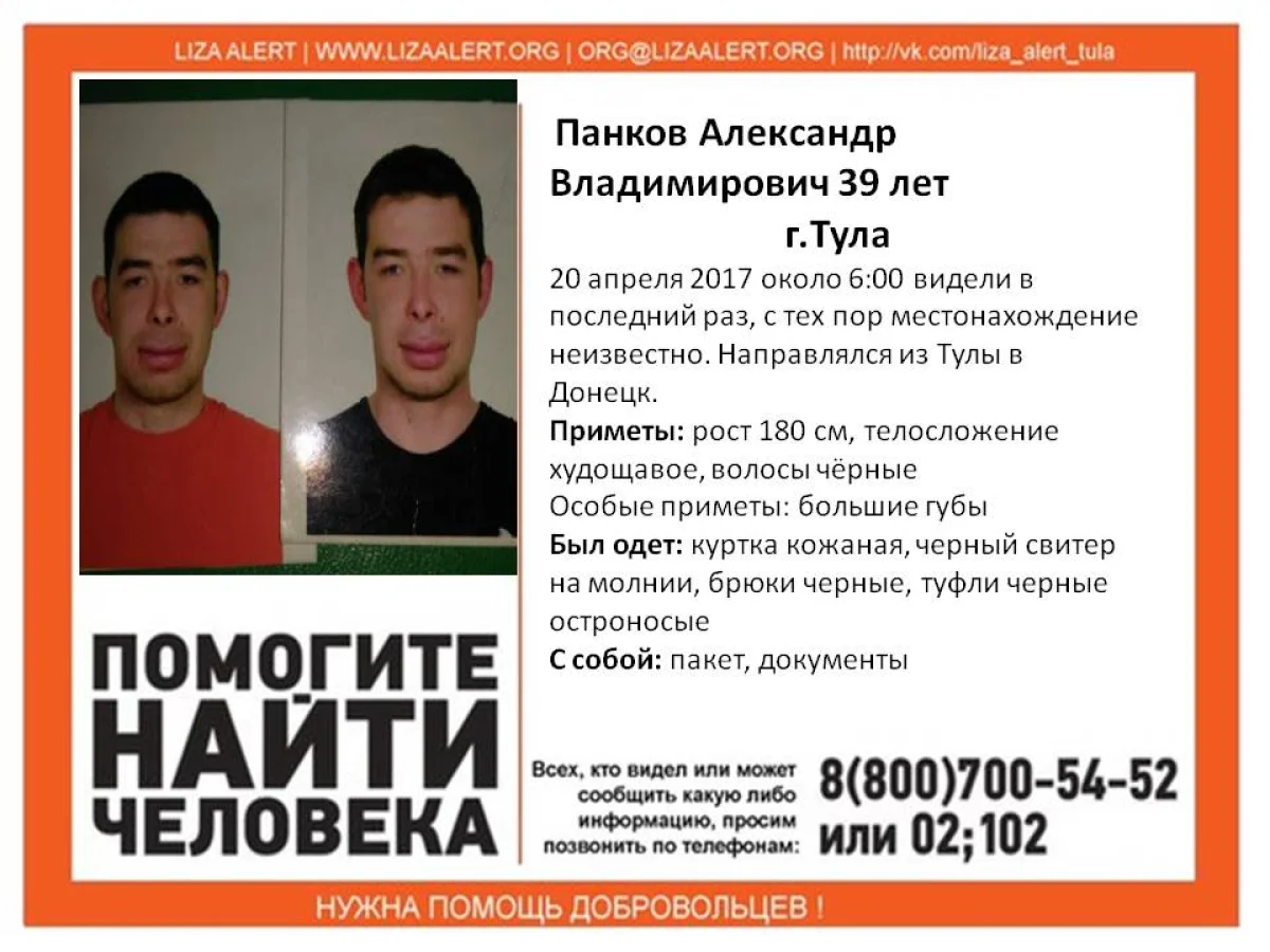 Панков Александр Владимирович направлялся из тулы в Донецк. Последний раз его видели 20 апреля около 6:00, с тех пор местонахождение неизвестно.