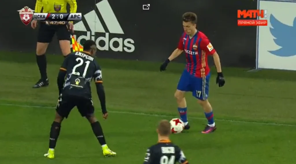 На 40-й минуте Головин принял мяч у линии штрафной, убрал на замахе Беляева, убежал вглубь и прострелил в центр – Чалов подставляет ногу – 2:0.