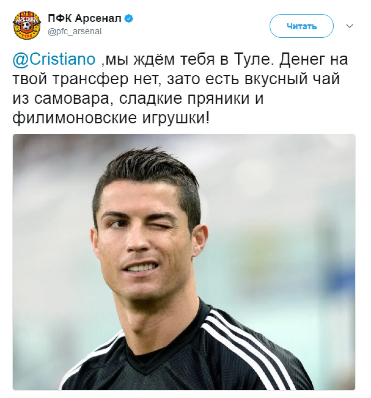 – Криштиану Роналду, мы ждем тебя в Туле! Денег на твой трансфер нет, зато есть вкусный чай из самовара, сладкие пряники и филимоновские игрушки! - гласит запись, размещённая на официальной странице тульского «Арсенала» в социальной сети «Твиттер».