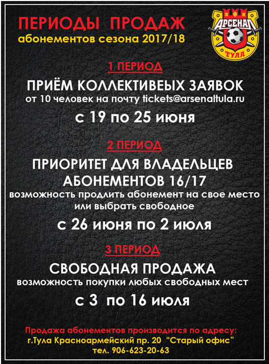 Сезонные абонементы можно приобрести по адресу: Красноармейский проспект, 20 (старый офис ПФК «Арсенал»). При себе иметь паспорт, старый абонемент (в случае наличия) и свидетельство о рождении ребенка (при покупке абонемента на семейный сектор). О времени работы офиса будет сообщено дополнительно. Контактный телефон: 8-906-623-20-63.
