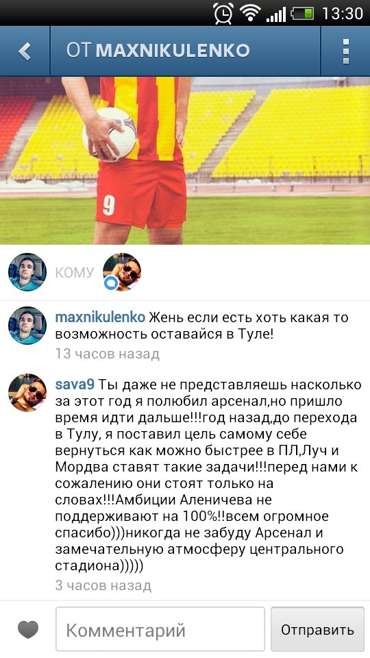 Футболист тульского «Арсенала» Евгений Савин в скором времени покинет клуб, в общении с одним из своих подписчиков в instagram игрок заявил, что перед красно-желтыми цель выйти в Премьер Лигу стоит только на словах.
