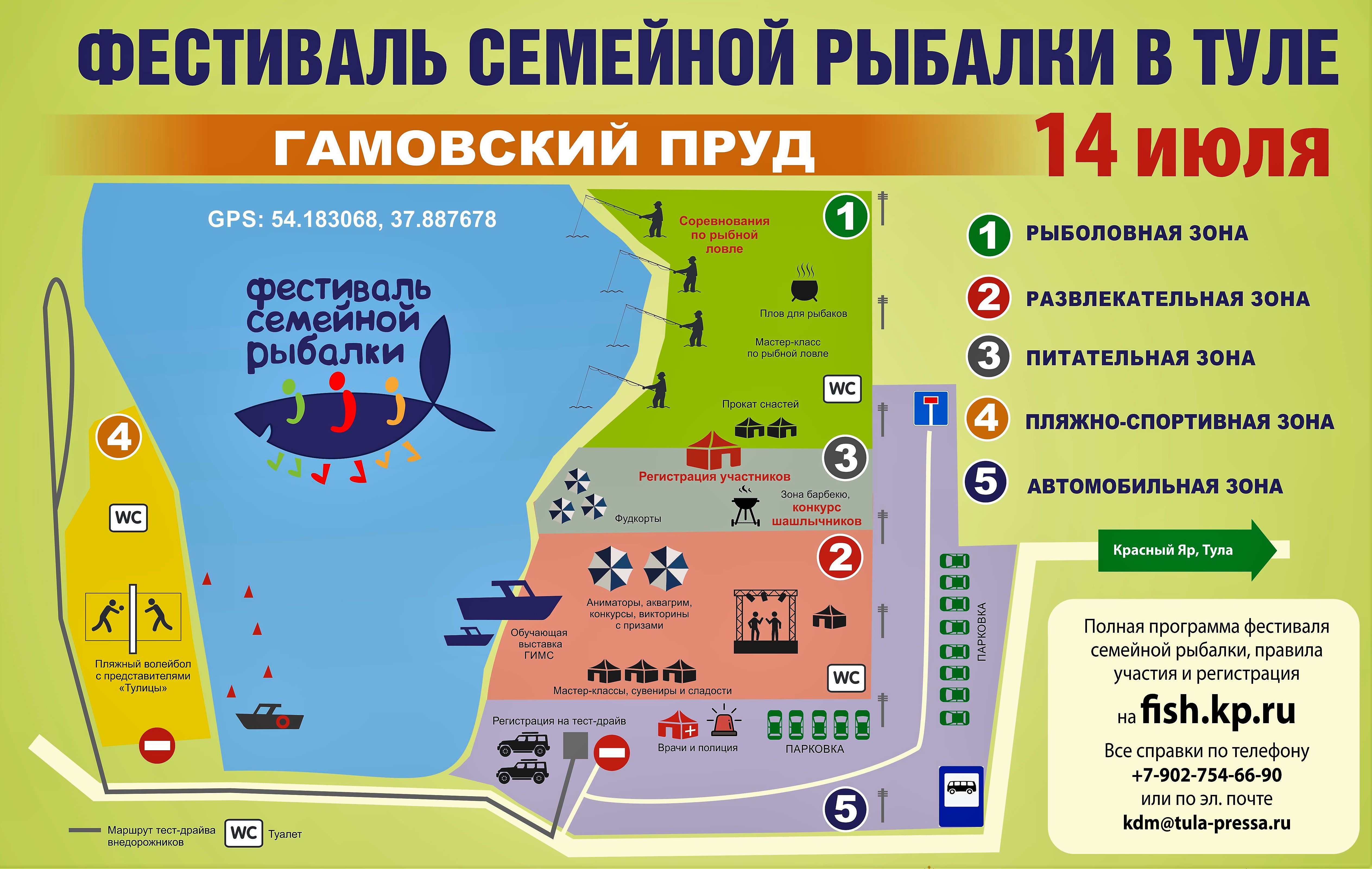 Напомним, 14 июля на Гамовском пруду в 14 км от Тулы состоится интересный семейно-спортивный праздник, организованный газетой «Комсомольская правда». Гостей Фестиваля ждут соревнования по рыбной ловле, конкурс на самый вкусный шашлык. аниматоры для детей, аквагримм, конкурсы, викторины и многое другое. Будет разыграно и подарено множество призов и сувениров.