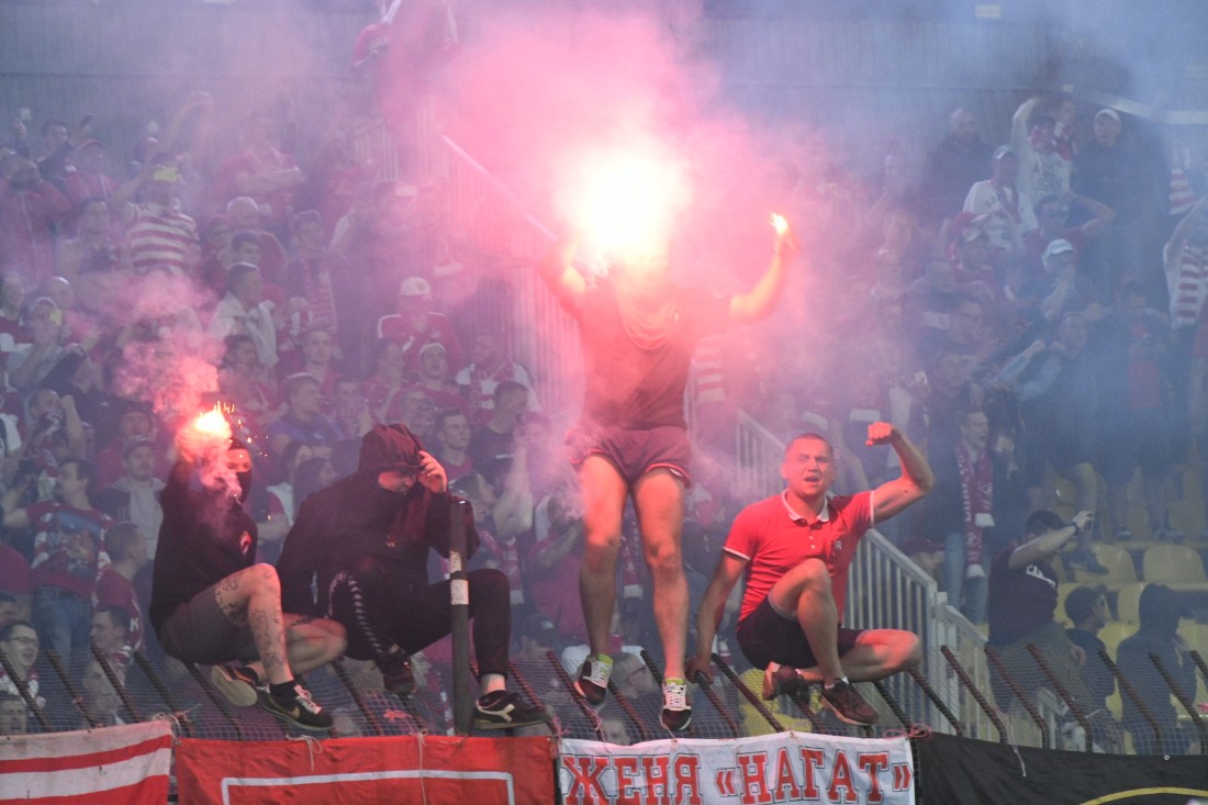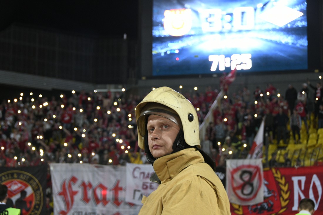 Второй тайм начался с традиционного пиротехнического шоу на спартаковских трибунах. Гостевой сектор заволокло густым дымом. После нескольких залпов хлопушек фанаты попытались поджечь выдранные с корнем пластиковые кресла. Но все попытки пироманов тут же пресекались подоспевшими пожарными.