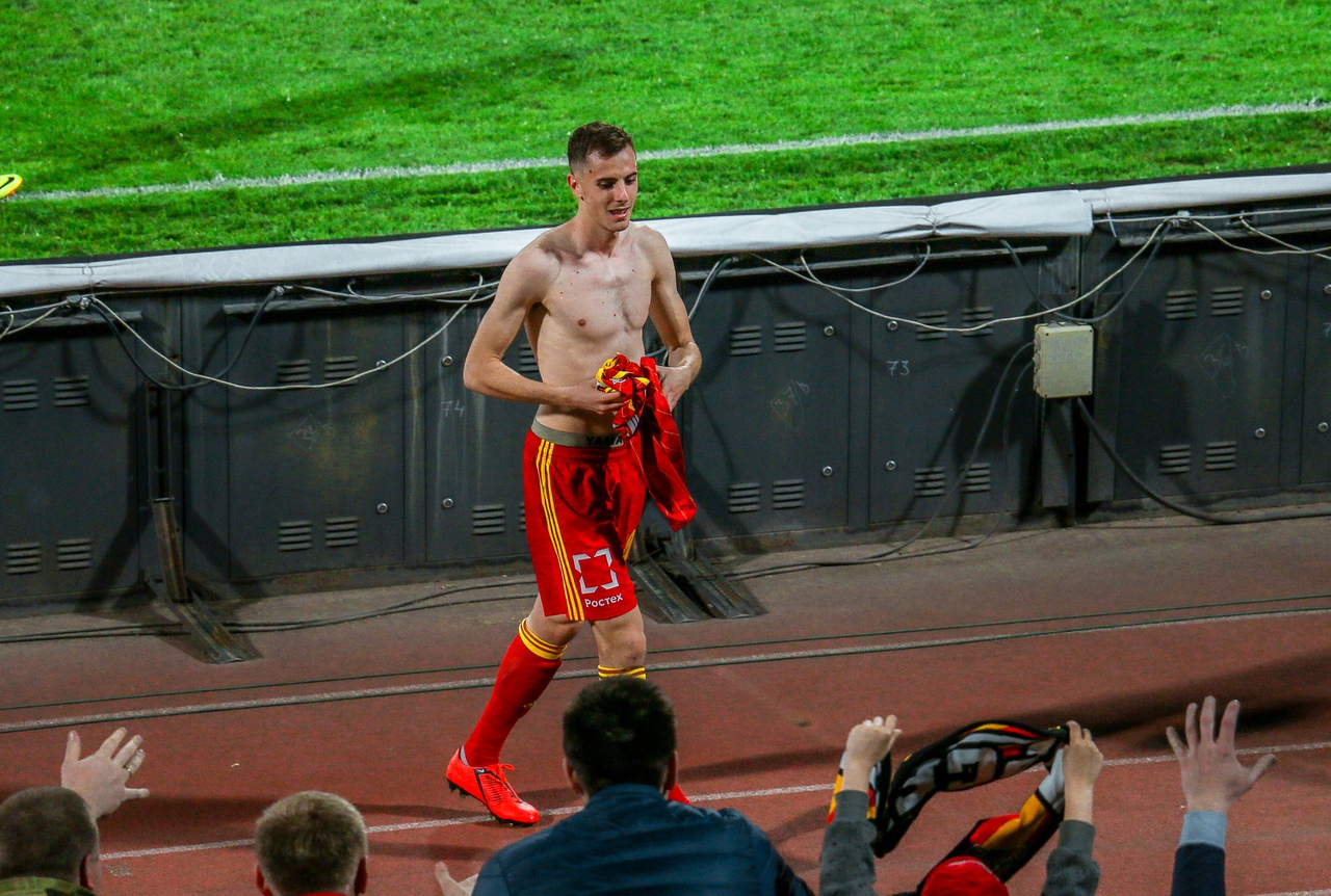 Натиск усиливался. Мирзов снова виртуозно разобрался с соперниками на левом фланге и отдал пас Ткачеву. Тот с острого угла расстрелял Максименко и тут же побежал вдоль трибун и своей скамейке, отмечая забитый гол — 2:0!