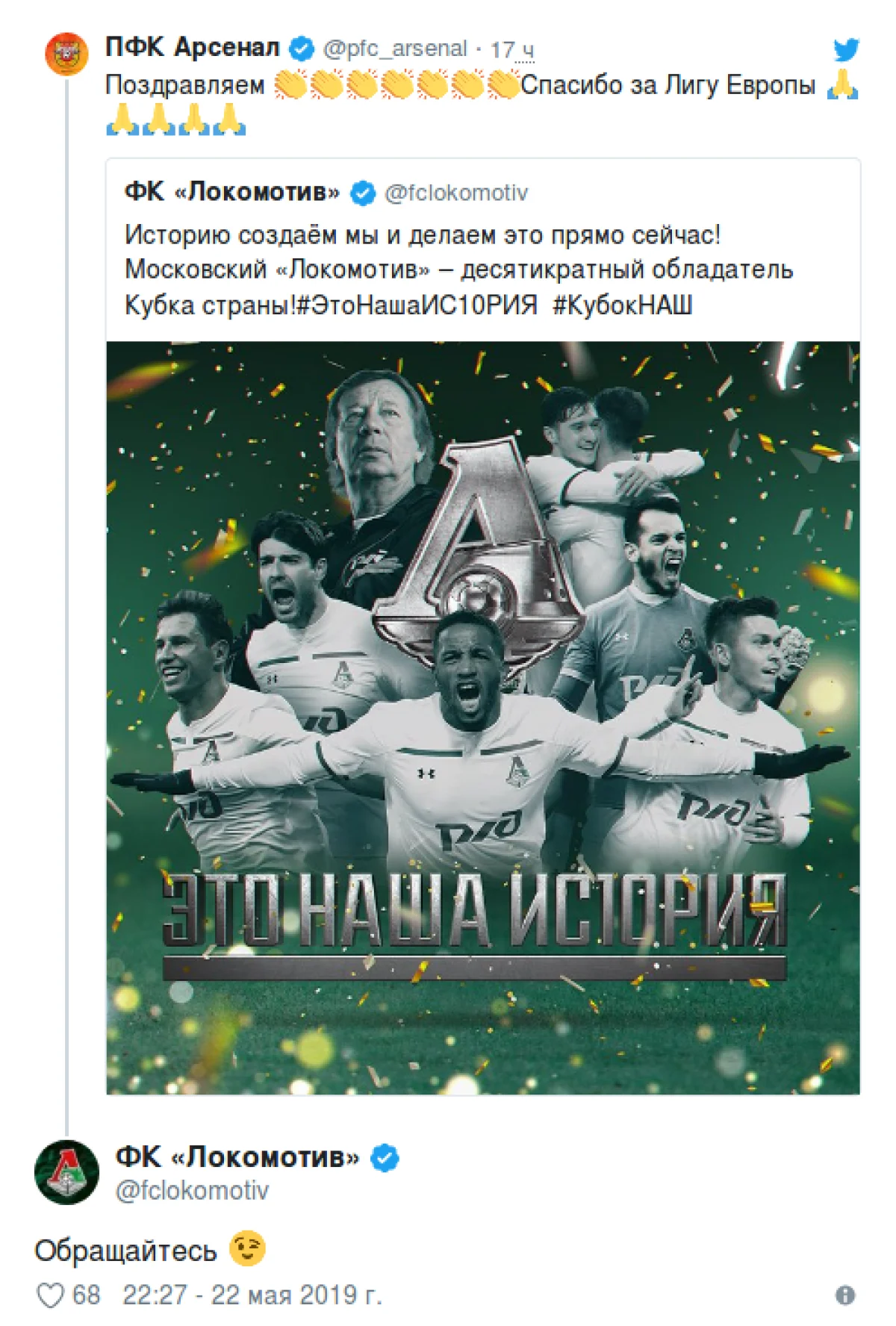 Московский «Локомотив» отреагировал на сообщение «Арсенала», который благодаря победе железнодорожников в Кубке России над «Уралом» (1:0) получил путевку в Лигу Европы.