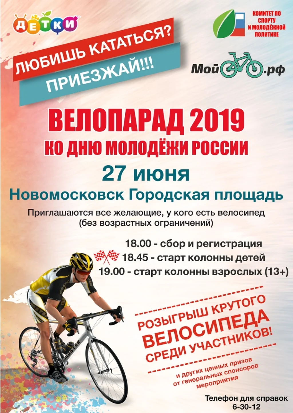 В честь Дня молодёжи в Новомосковске пройдёт велопарад. Кроме традиционных «покатушек», участников праздника ждёт розыгрыш призов от спонсоров. Главный приз – крутой велосипед!
