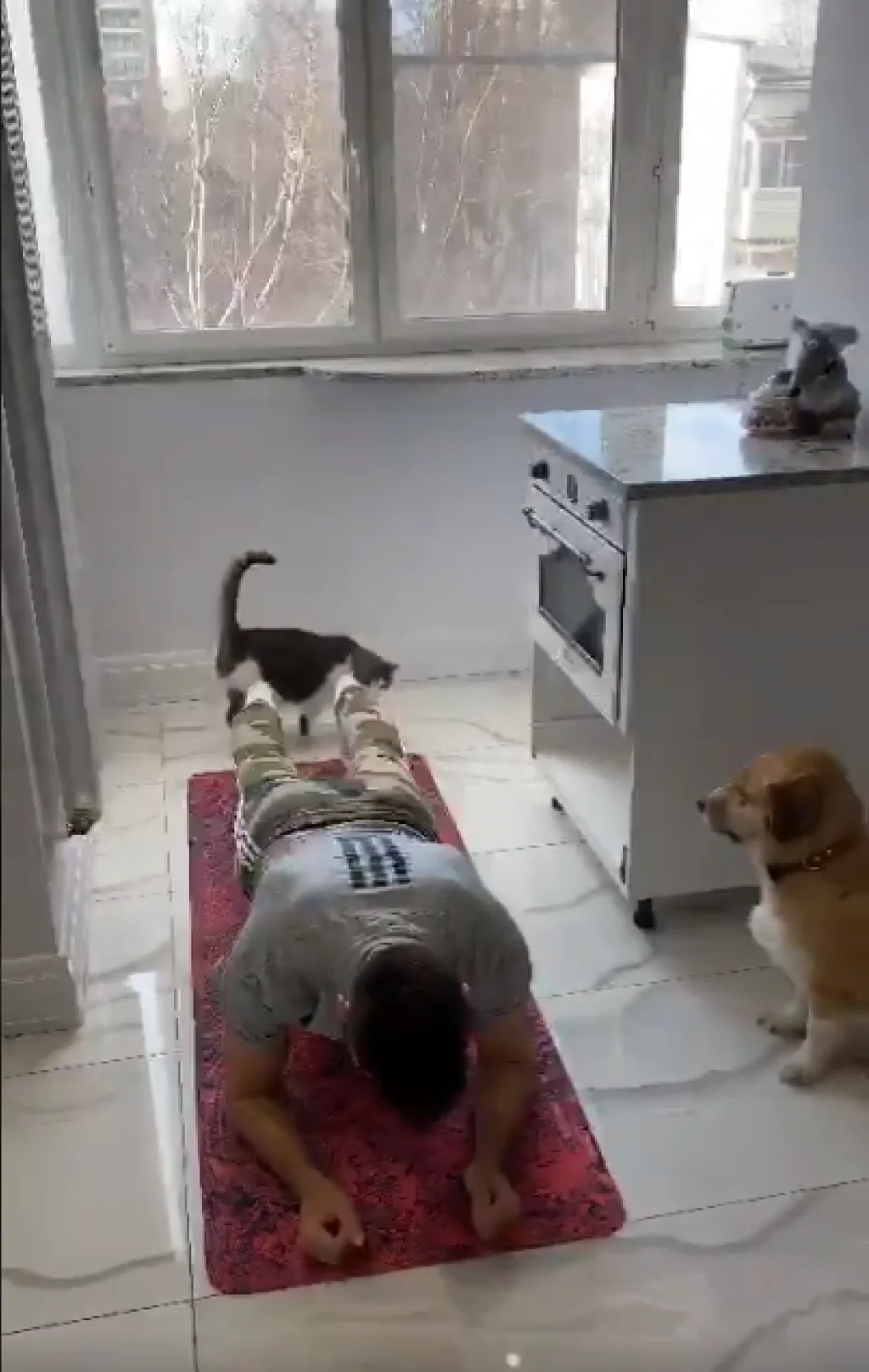 четвероногих друзей — кота и корги. А после сета упражнений Максим Беляев по совету врача тщательно моет