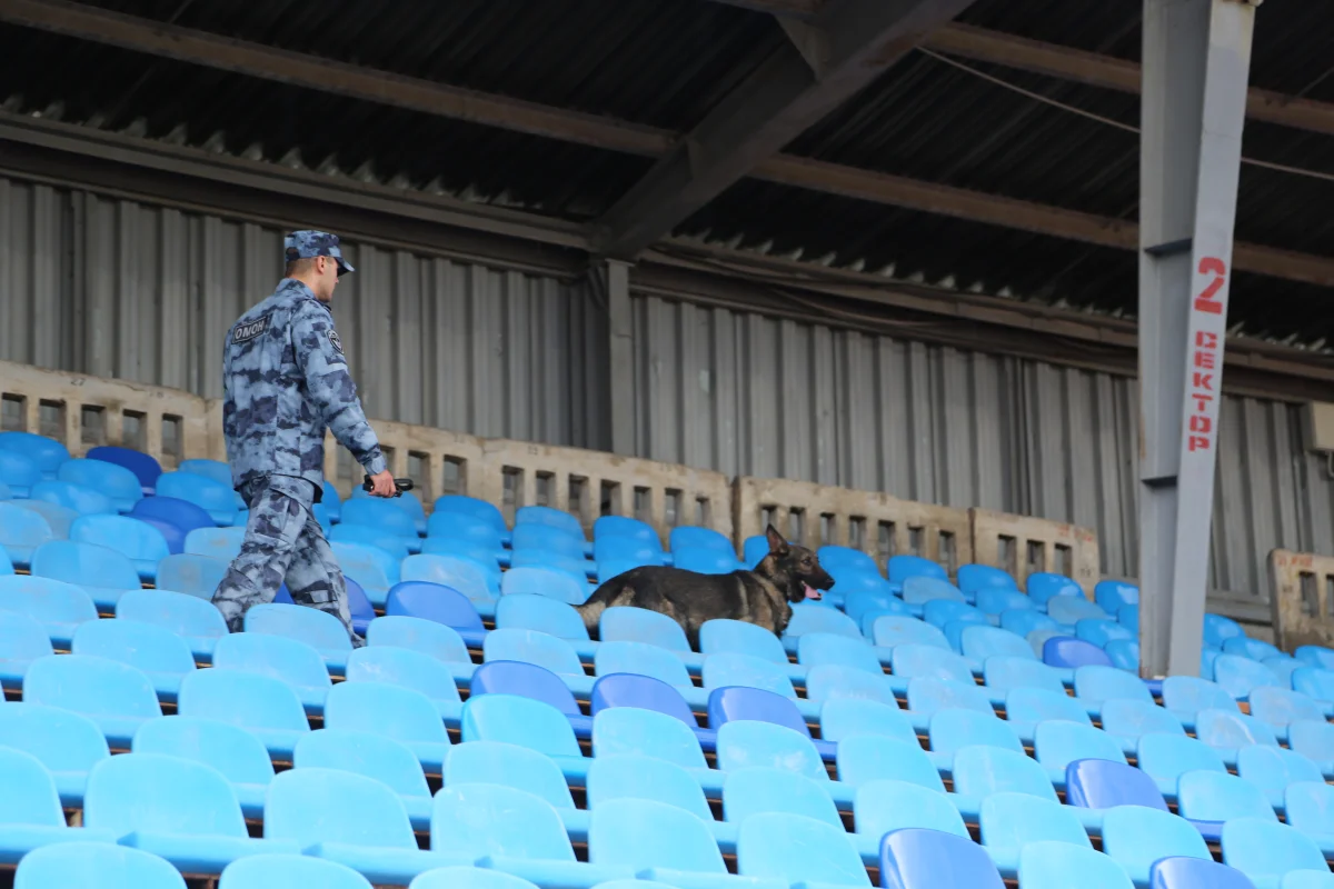 Перед началом игры 15 тура чемпионата России между «Арсеналом» и «Ротором» Центральный стадион и прилегающую к нему территорию обследуют кинологи и специалисты инженерных подразделений Росгвардии.
