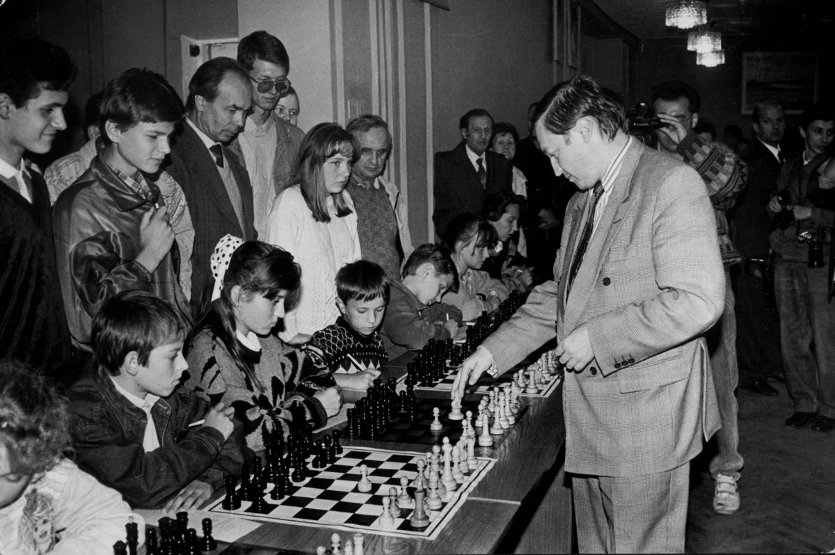 На фото: сеанс одновременной игры Анатолия Карпова в Тульском шахматном клубе